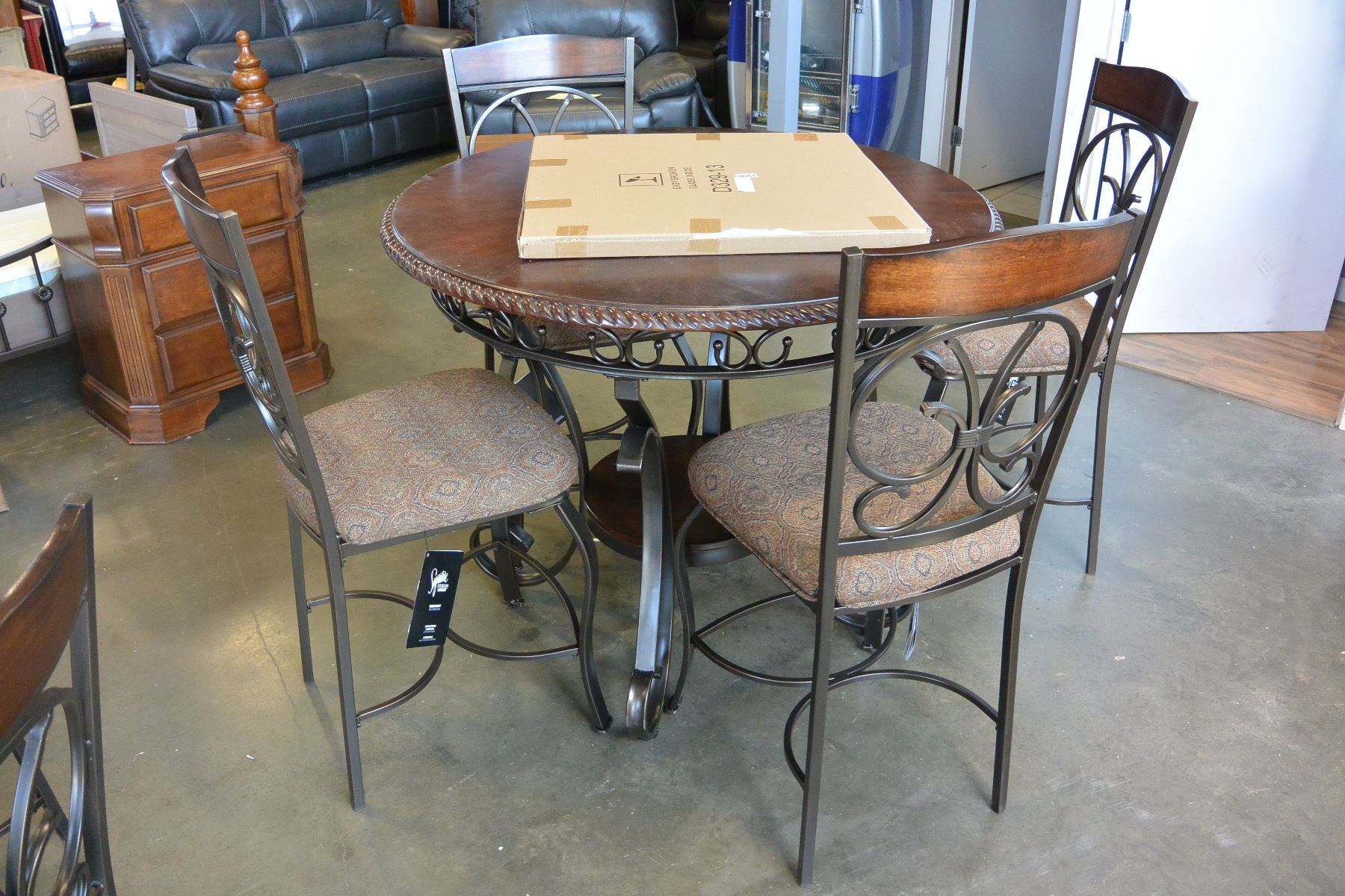 NEW ASHLEY SIGNATURE DESIGN ROUND COUNTER HEIGHT MAHOGANY WITH GLASS DINING TABLE, AND 4 ULPHOSTERED