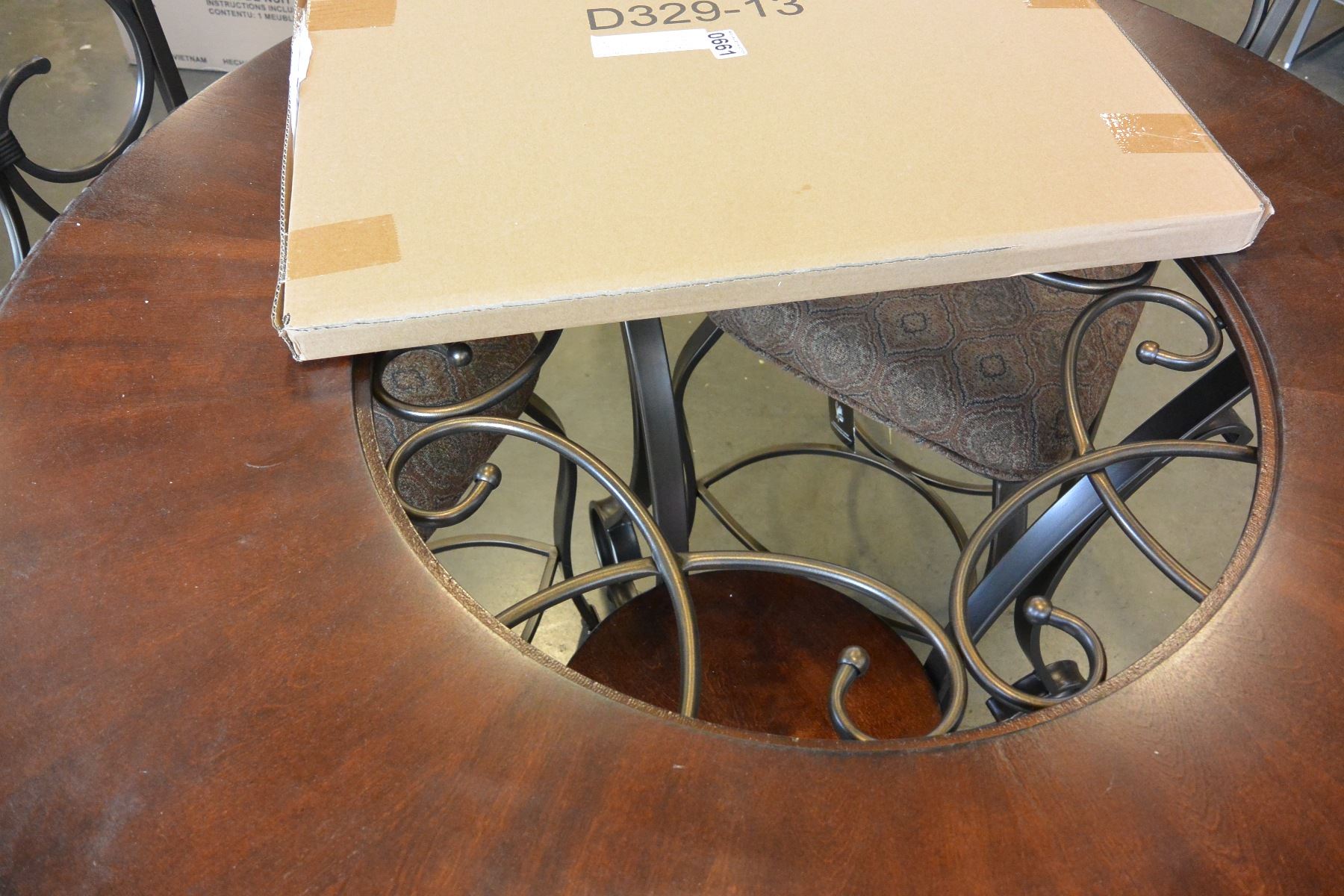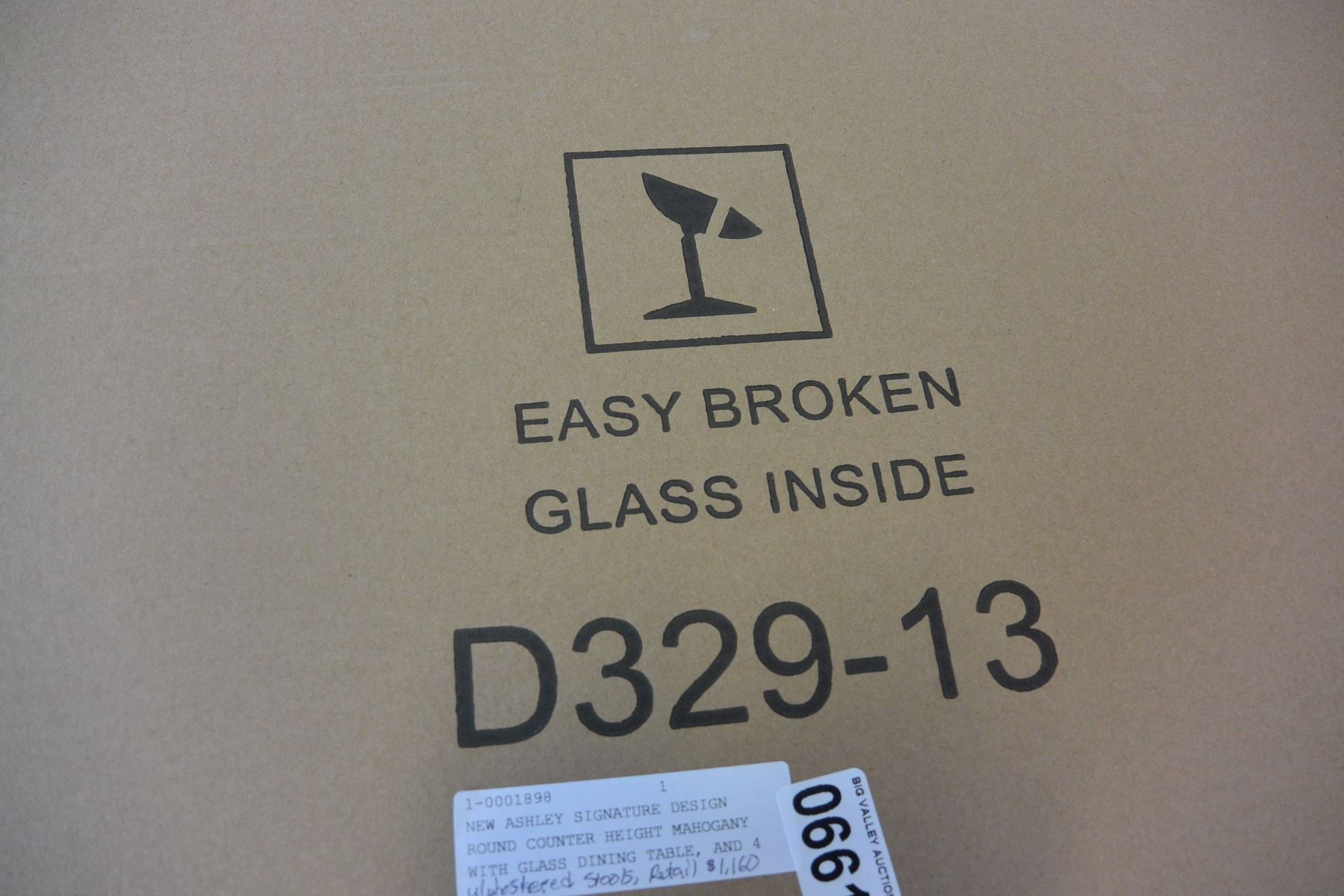 NEW ASHLEY SIGNATURE DESIGN ROUND COUNTER HEIGHT MAHOGANY WITH GLASS DINING TABLE, AND 4 ULPHOSTERED STOOLS, RETAIL $1160