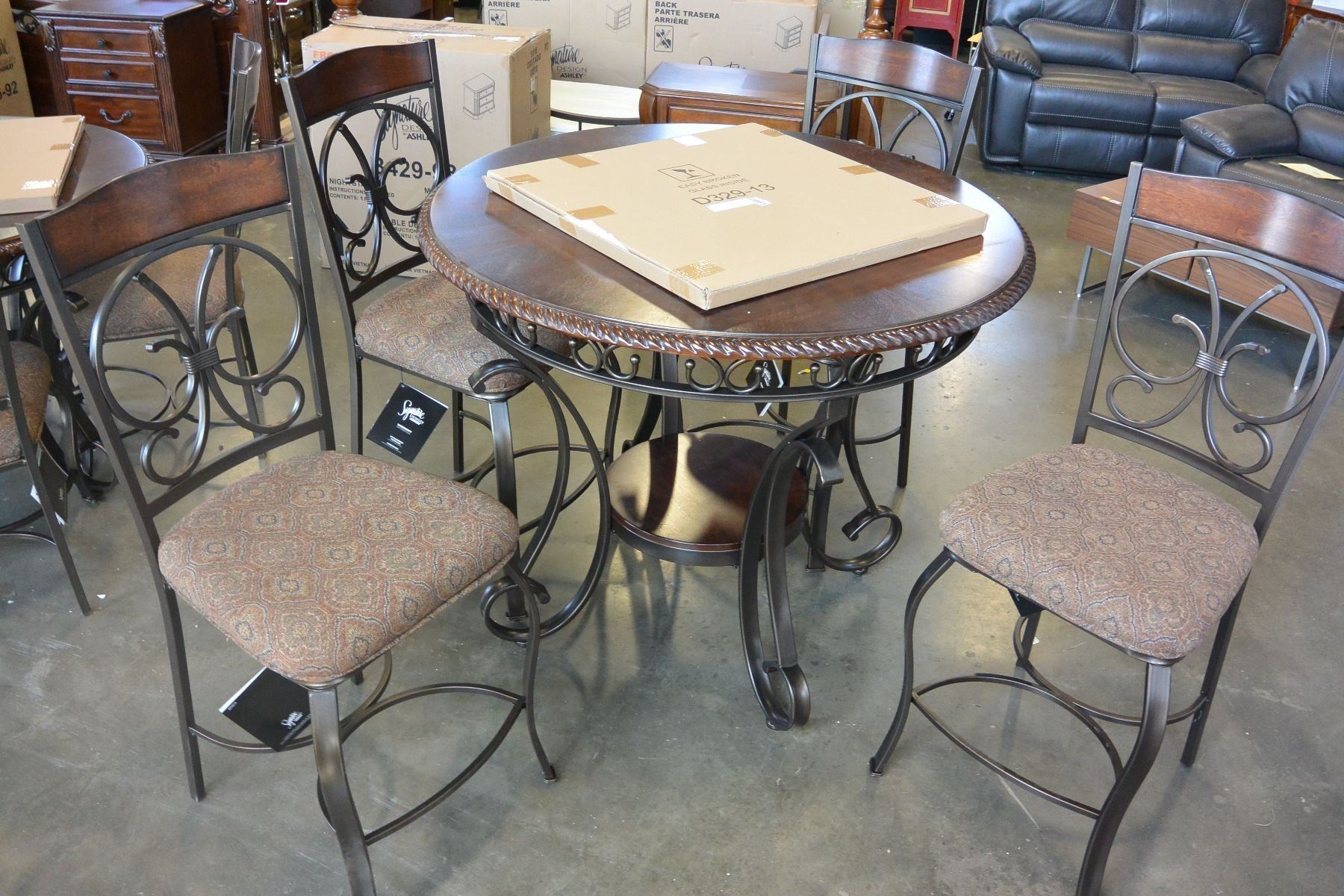 NEW ASHLEY SIGNATURE DESIGN ROUND COUNTER HEIGHT MAHOGANY WITH GLASS DINING TABLE, AND 4 ULPHOSTERED