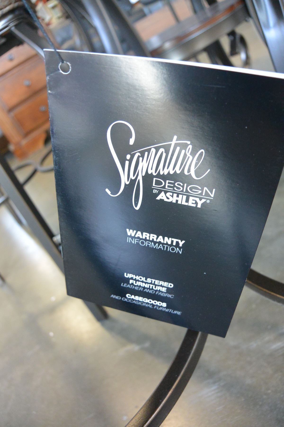 NEW ASHLEY SIGNATURE DESIGN ROUND COUNTER HEIGHT MAHOGANY WITH GLASS DINING TABLE, AND 4 ULPHOSTERED STOOLS, RETAIL $1160
