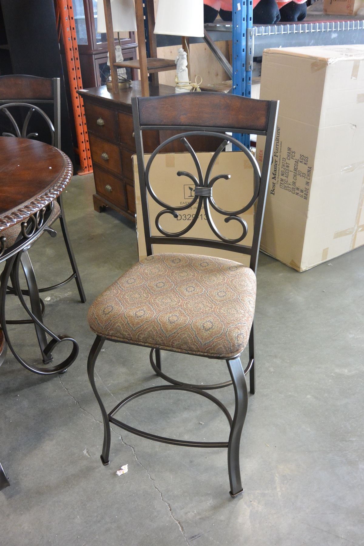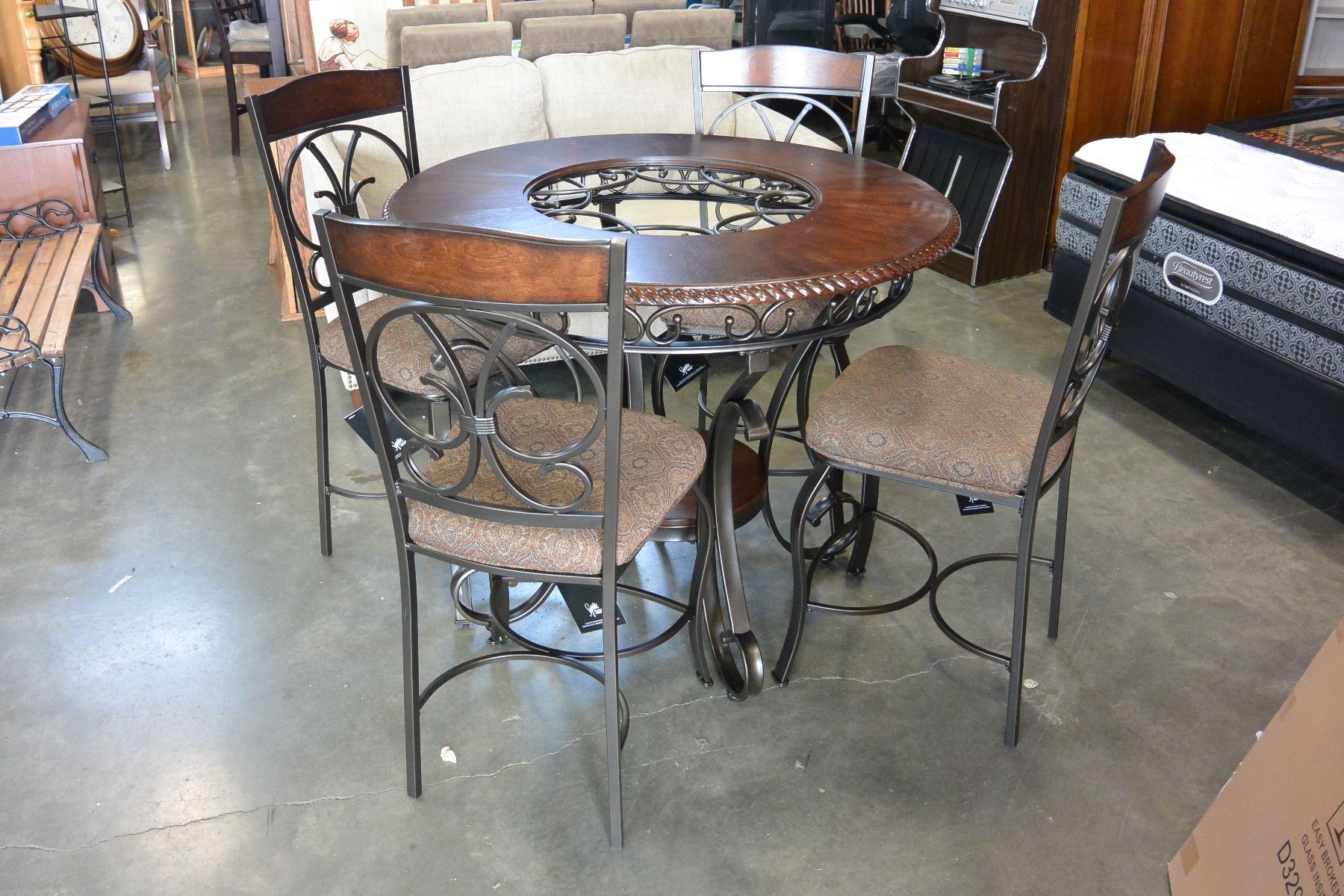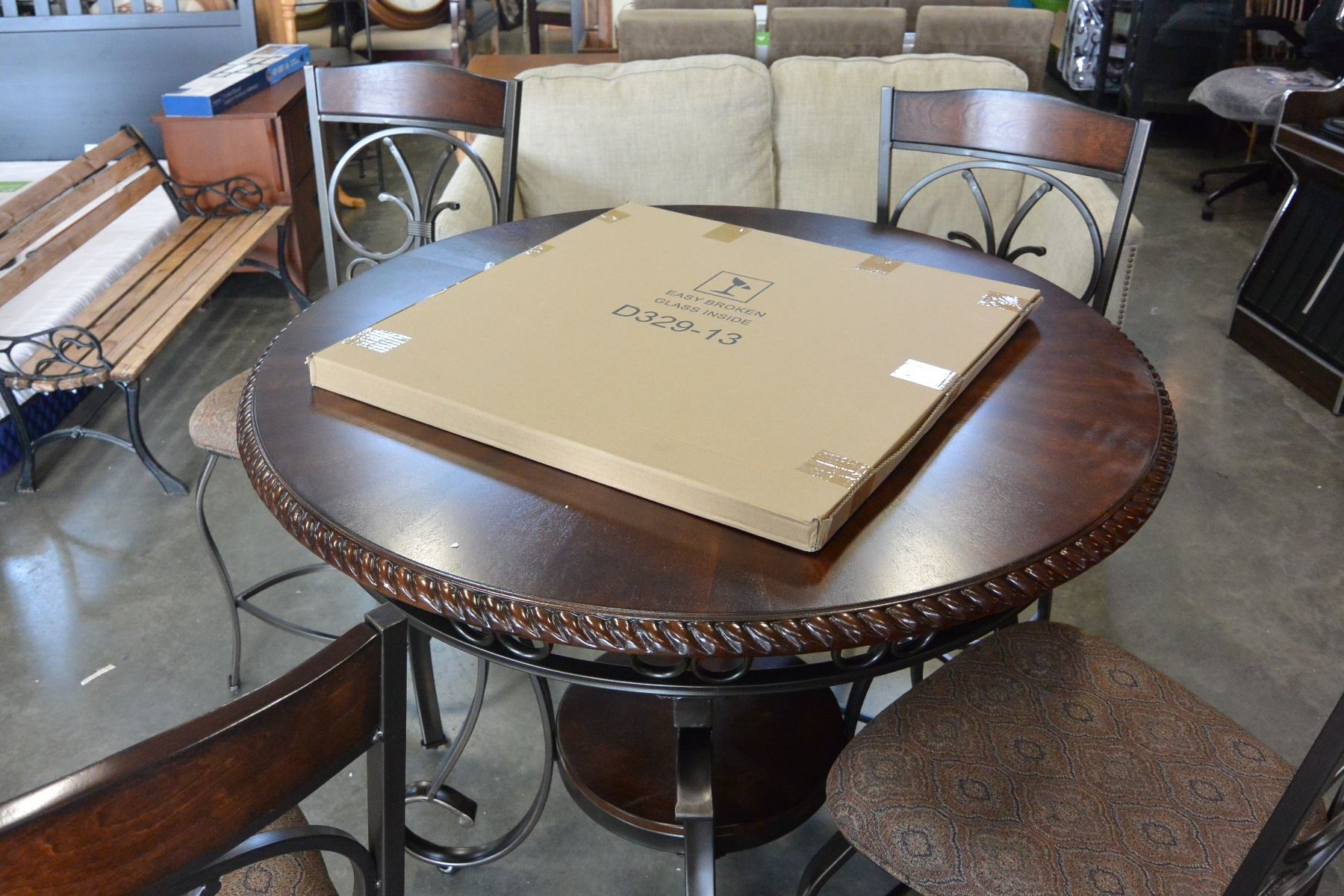 NEW ASHLEY SIGNATURE DESIGN ROUND MAHOGANY COUNTER HEIGHT DINING TABLE WITH 4 UPHOLSTERED BAR STOOLS, RETAIL $1160