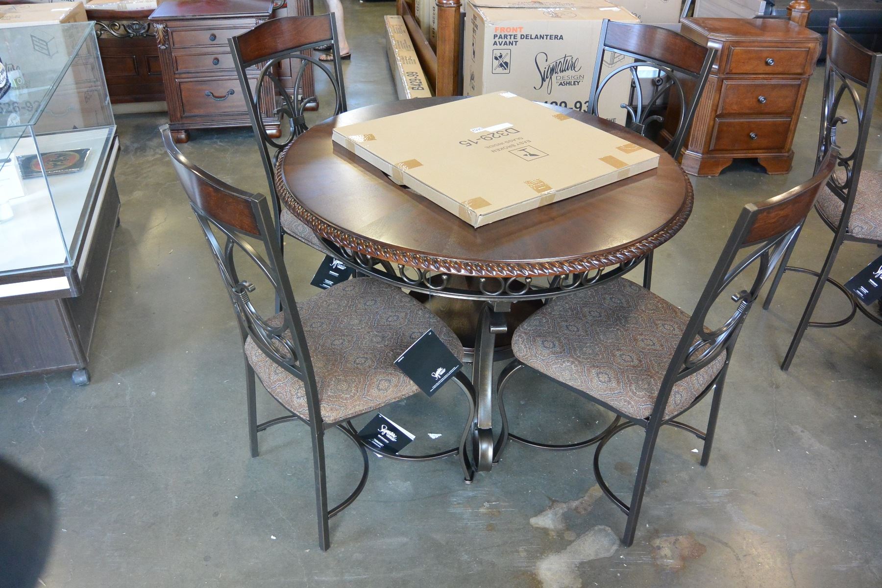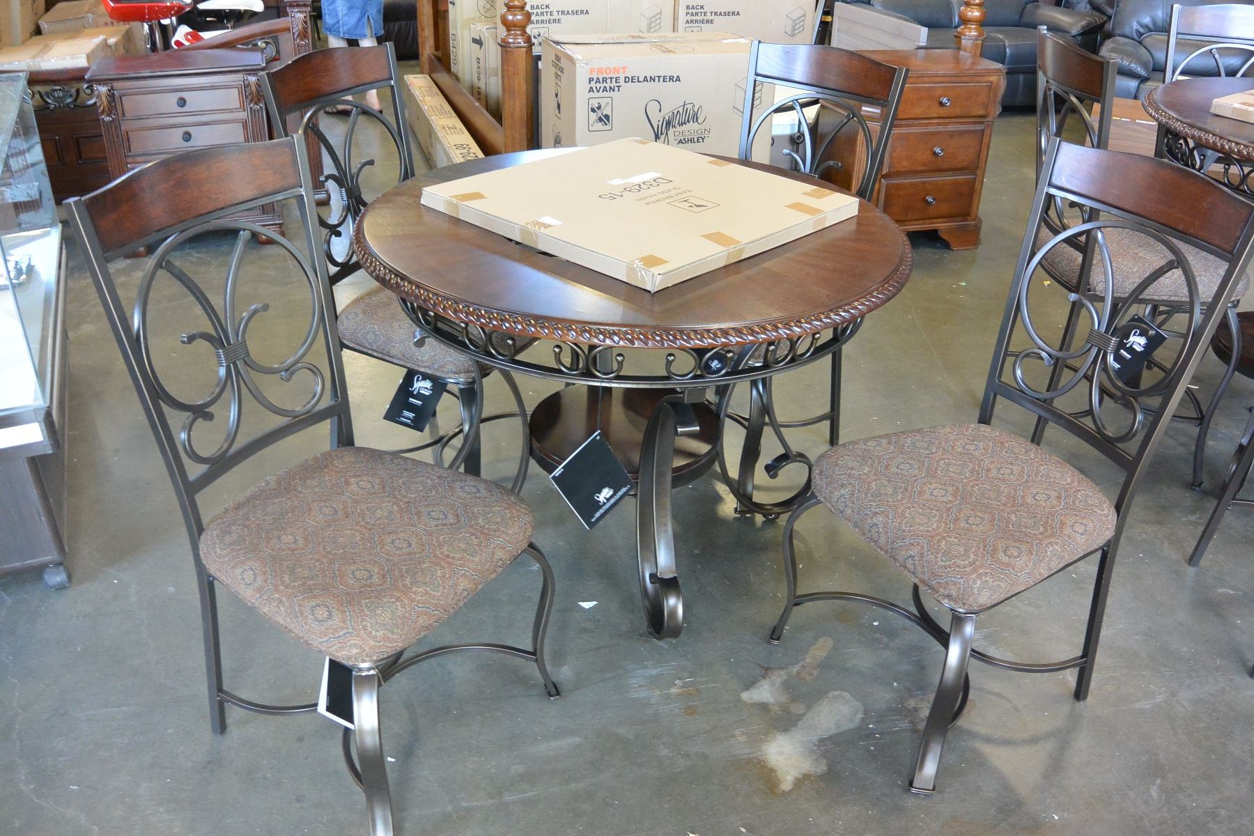 NEW ASHLEY SIGNATURE DESIGN ROUND MAHOGANY WITH GLASS DINING TABLE, AND 4 ULPHOSTERED SIDE CHAIRS, RETAIL $936