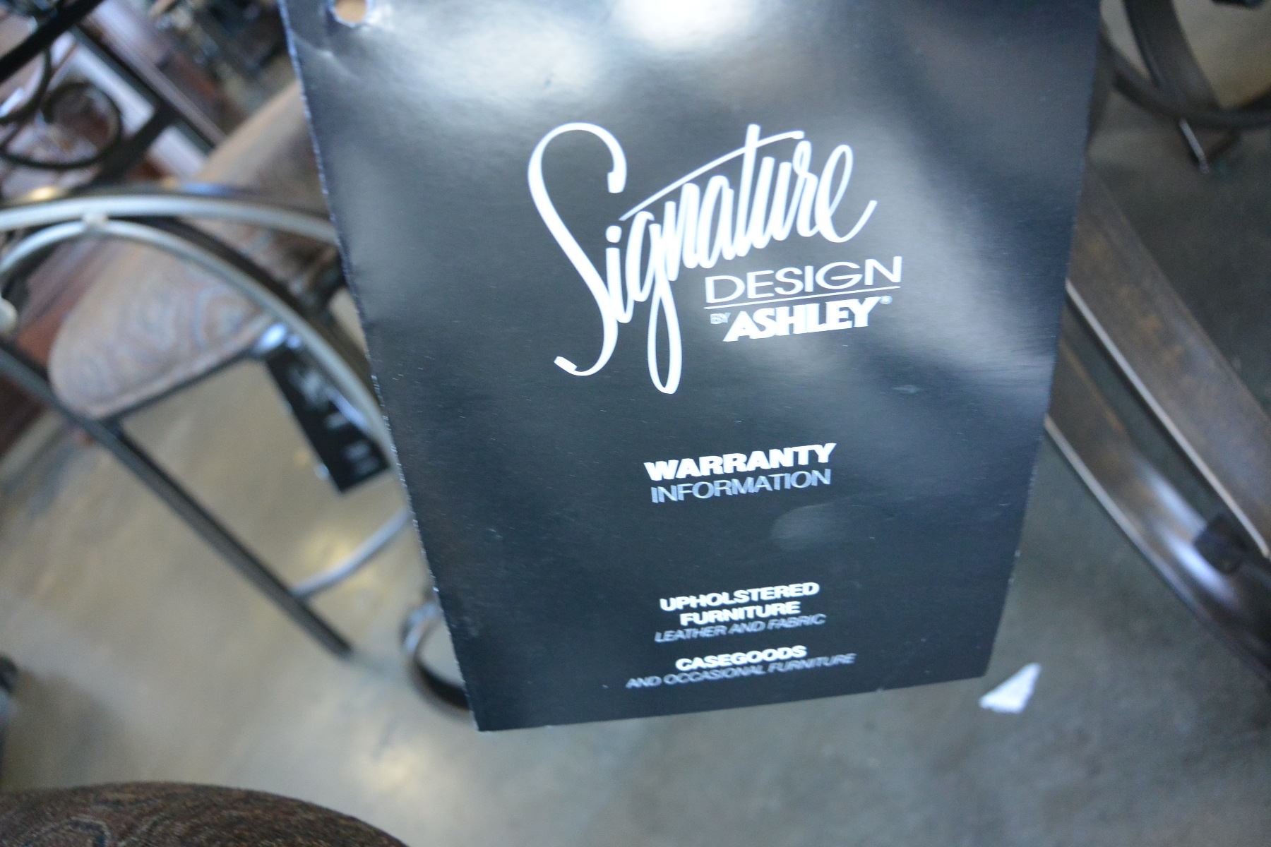 NEW ASHLEY SIGNATURE DESIGN ROUND MAHOGANY WITH GLASS DINING TABLE, AND 4 ULPHOSTERED SIDE CHAIRS, R