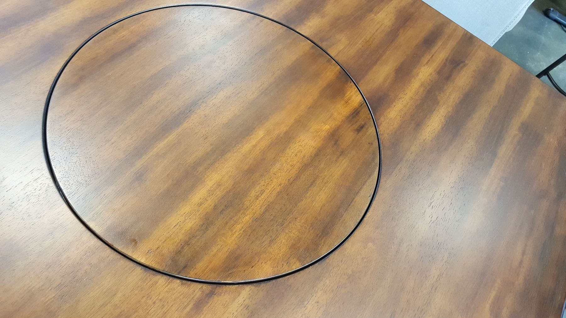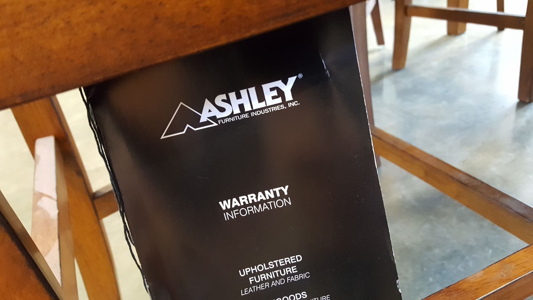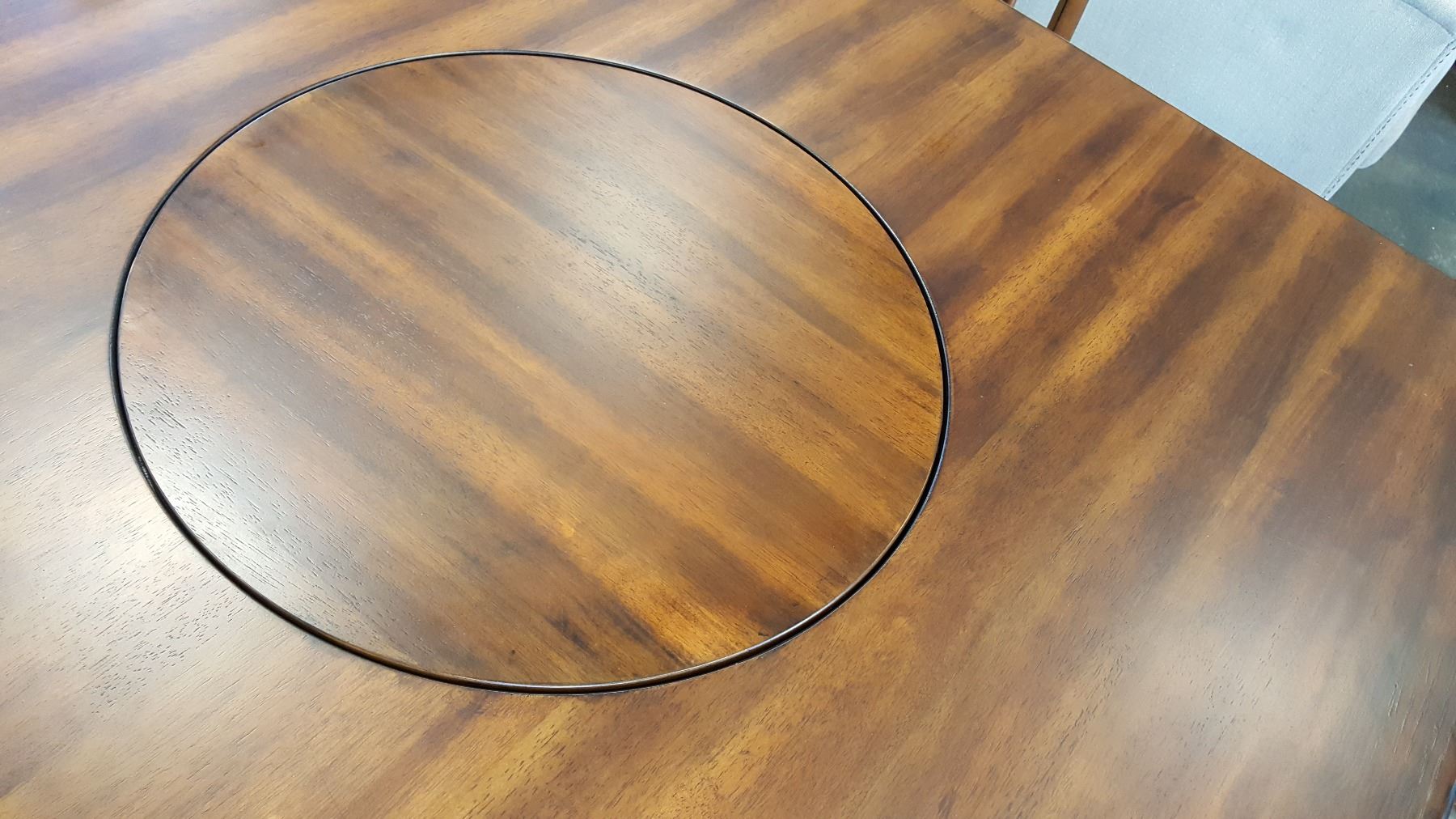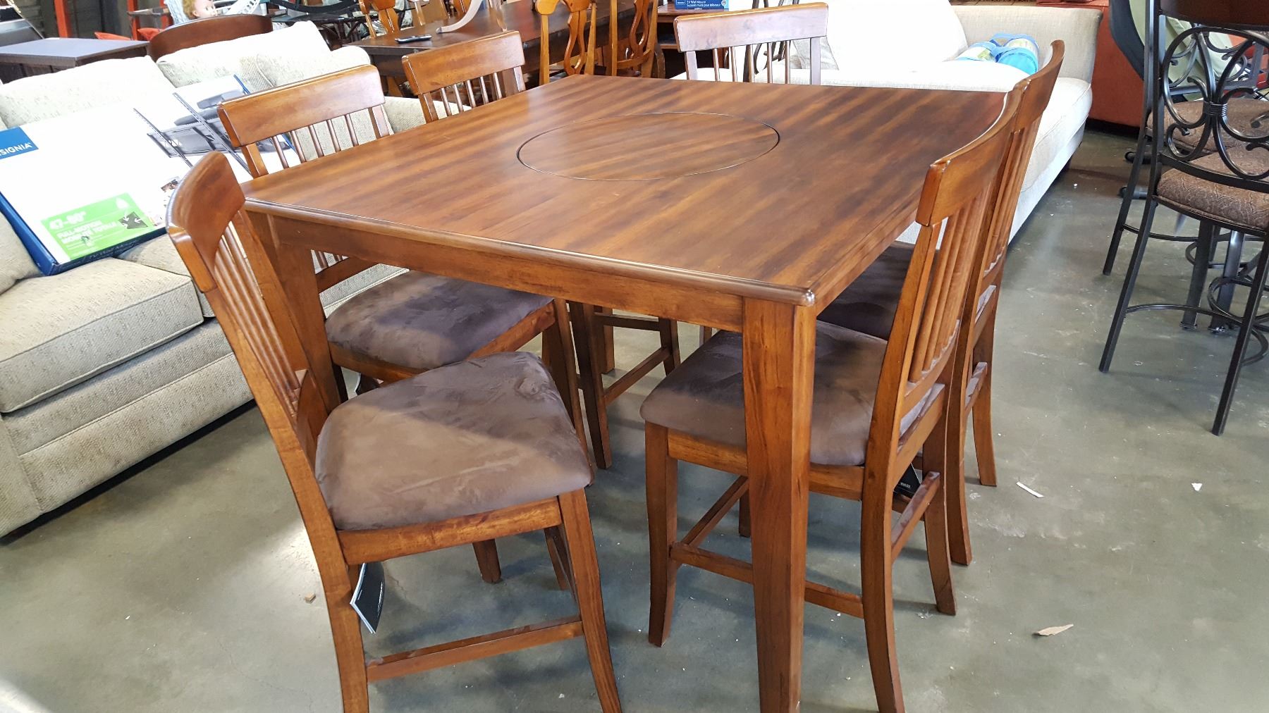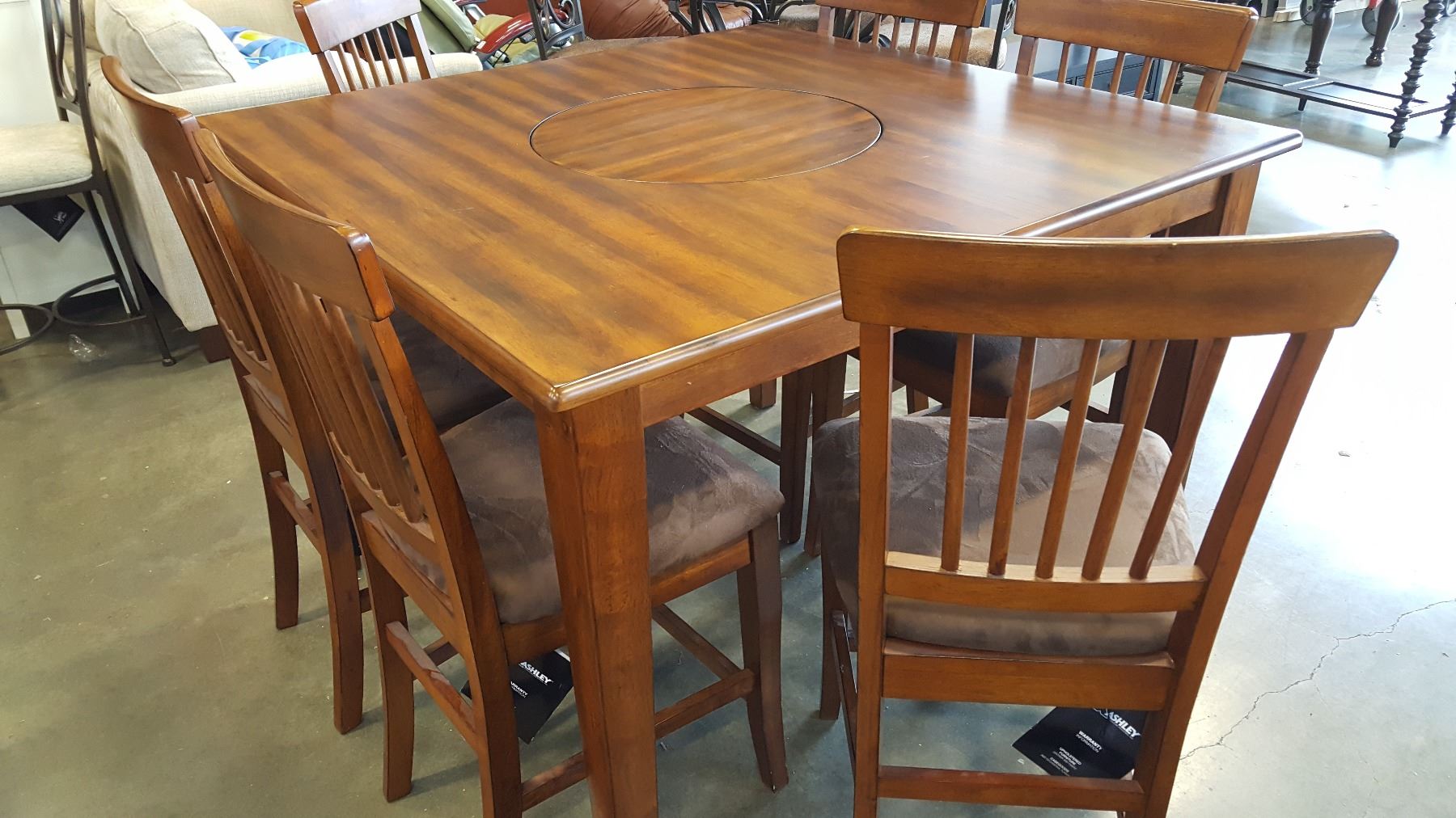 NEW ASHLEY SIGNATURE DESIGN SQAURE COUNTER HEIGHT DINING TABLE WITH LAZY SUSAN, AND 6 ULPHOSTERED STOOLS RETAIL $1,899