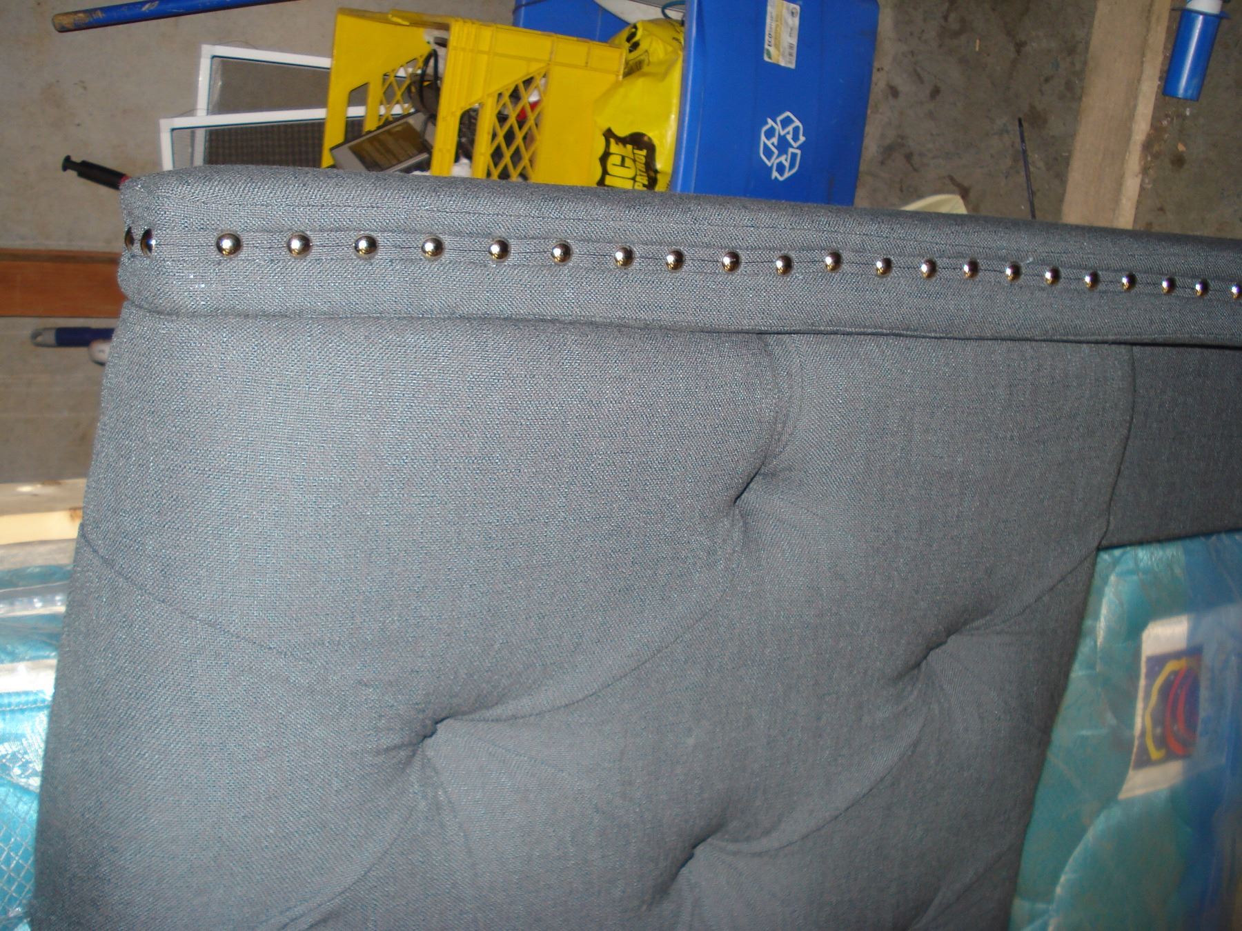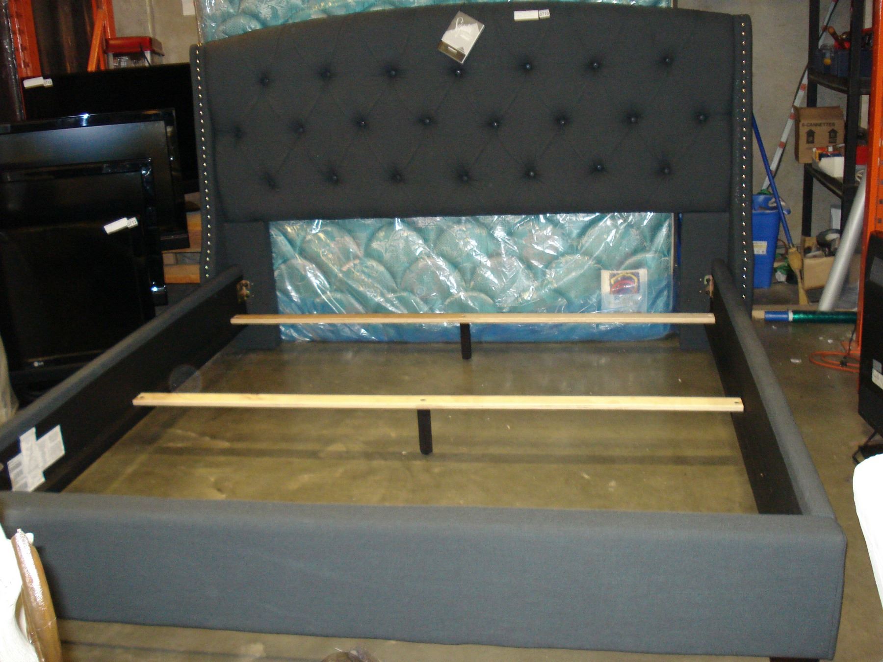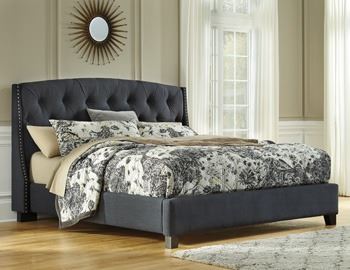 NEW ASHLEY SIGNATURE KINGSIZE MODERN GREY FABRIC PANEL BEDFRAME WITH NAILHEAD ACCENT RETAIL $1400