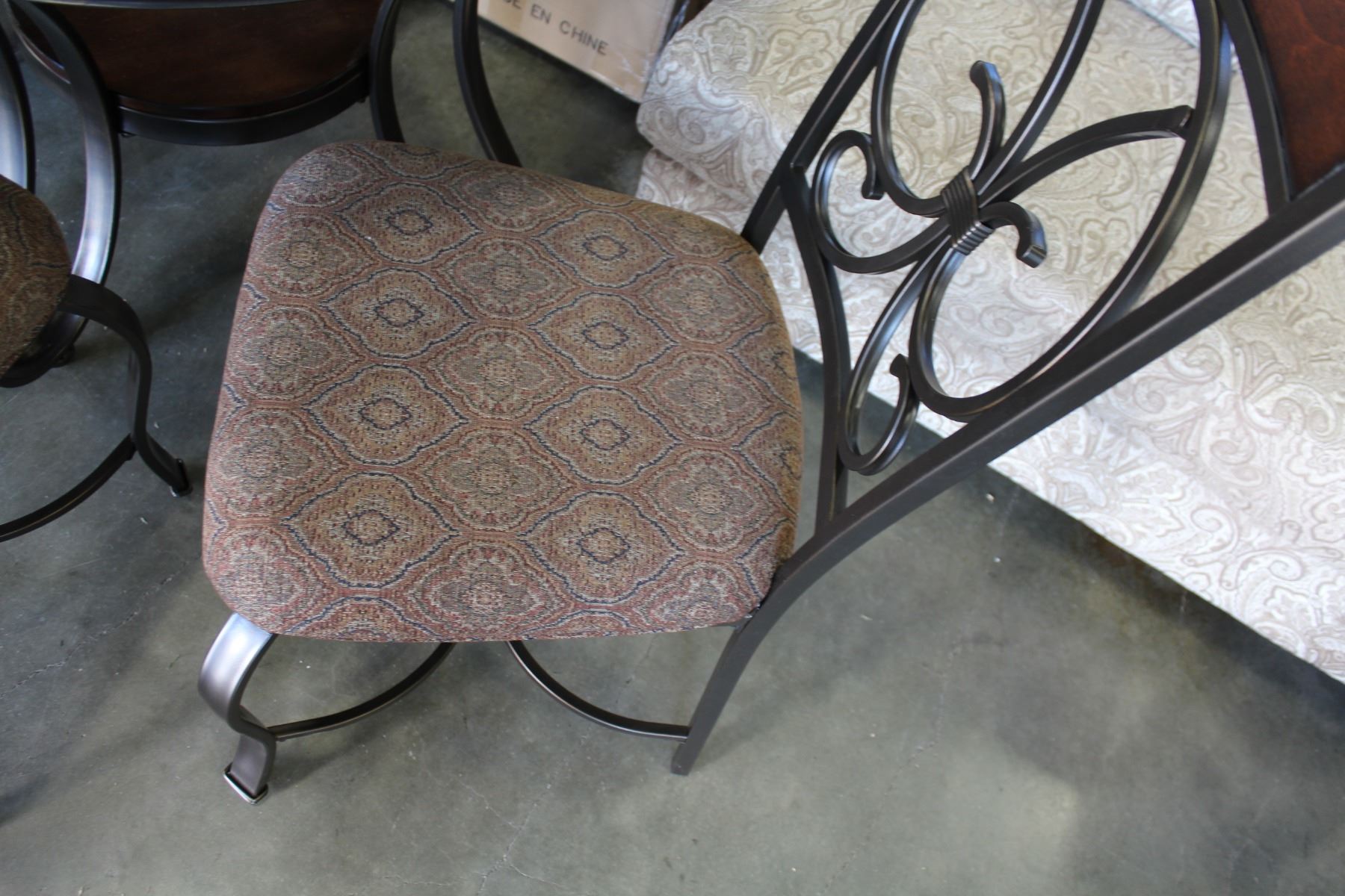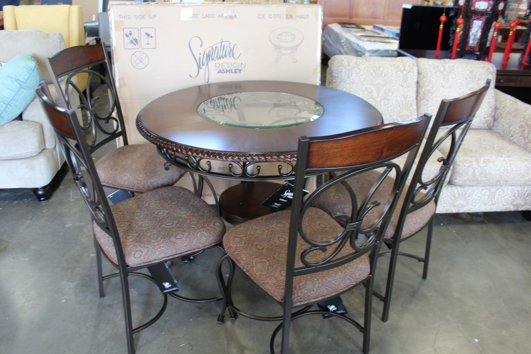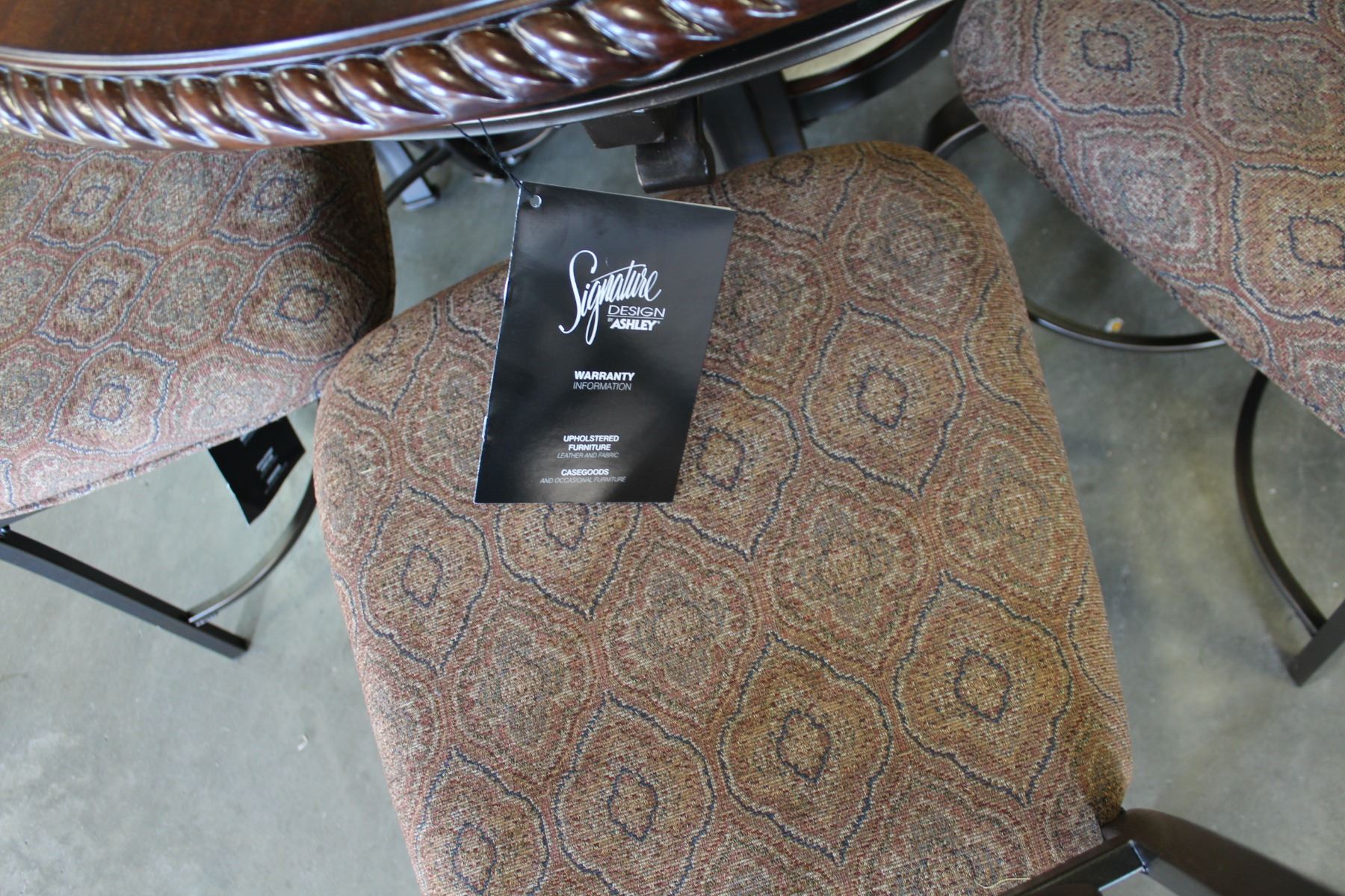 NEW ASHLEY SIGNATURE ROUND CARVED MAHOGANY DINING TABLE WITH 4 UPHOLSTERED CHAIRS, RETAIL $1036