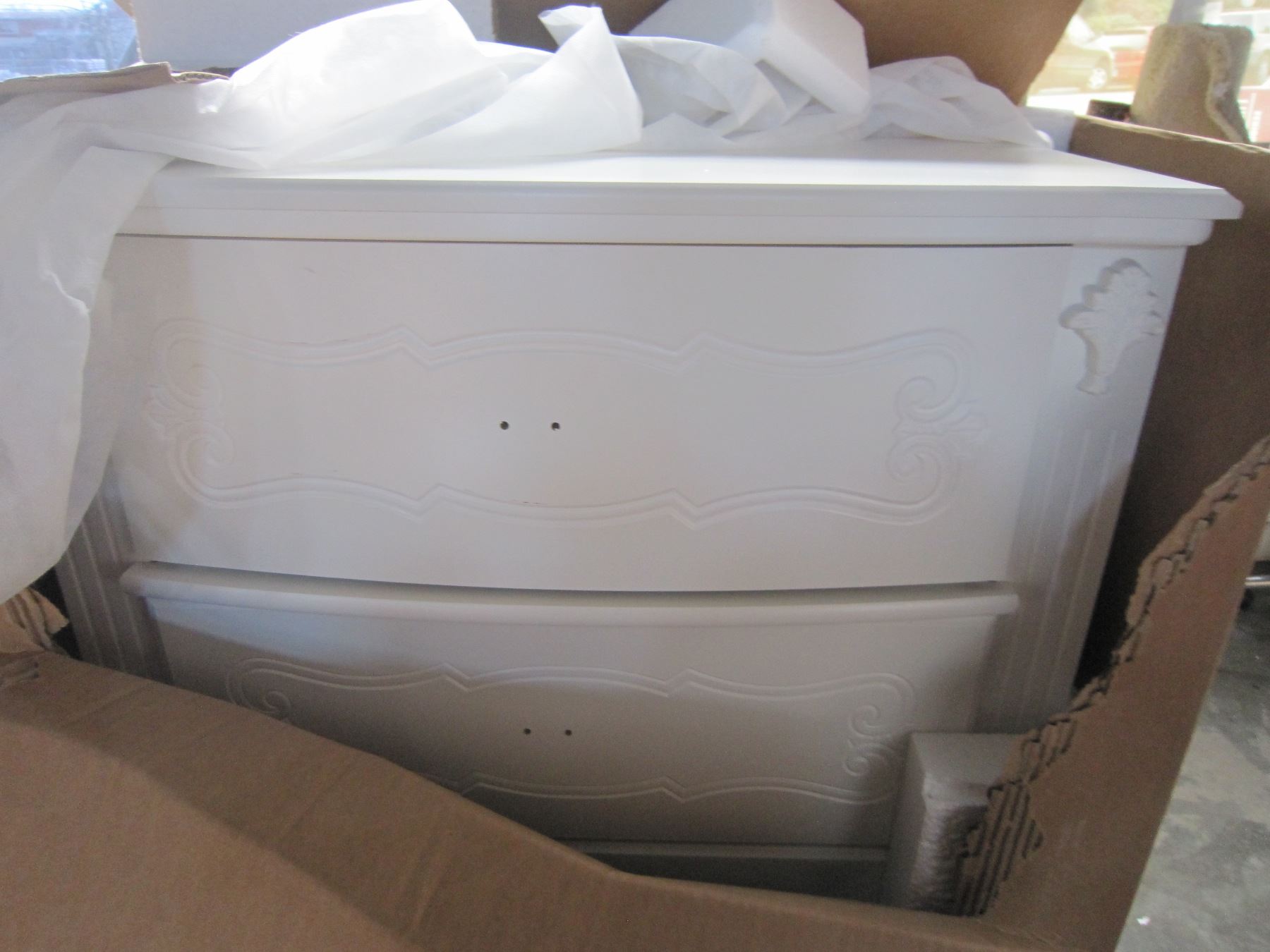 NEW ASHLEY WHITE CARVED 5 DRAWER CHEST, MINOR FREIGHT DAMAGE RETAIL $799