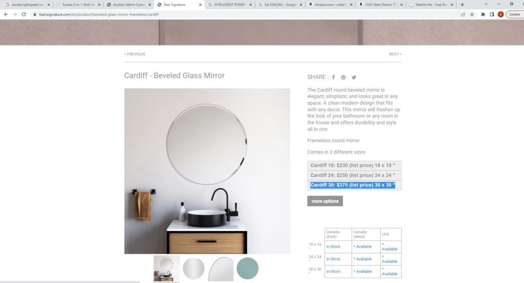 NEW BAIN SIGNATURE CARDIFF 30 FRAMELESS MIRROR 30" RETAIL $375