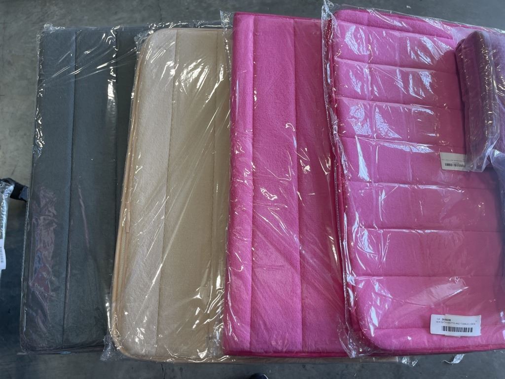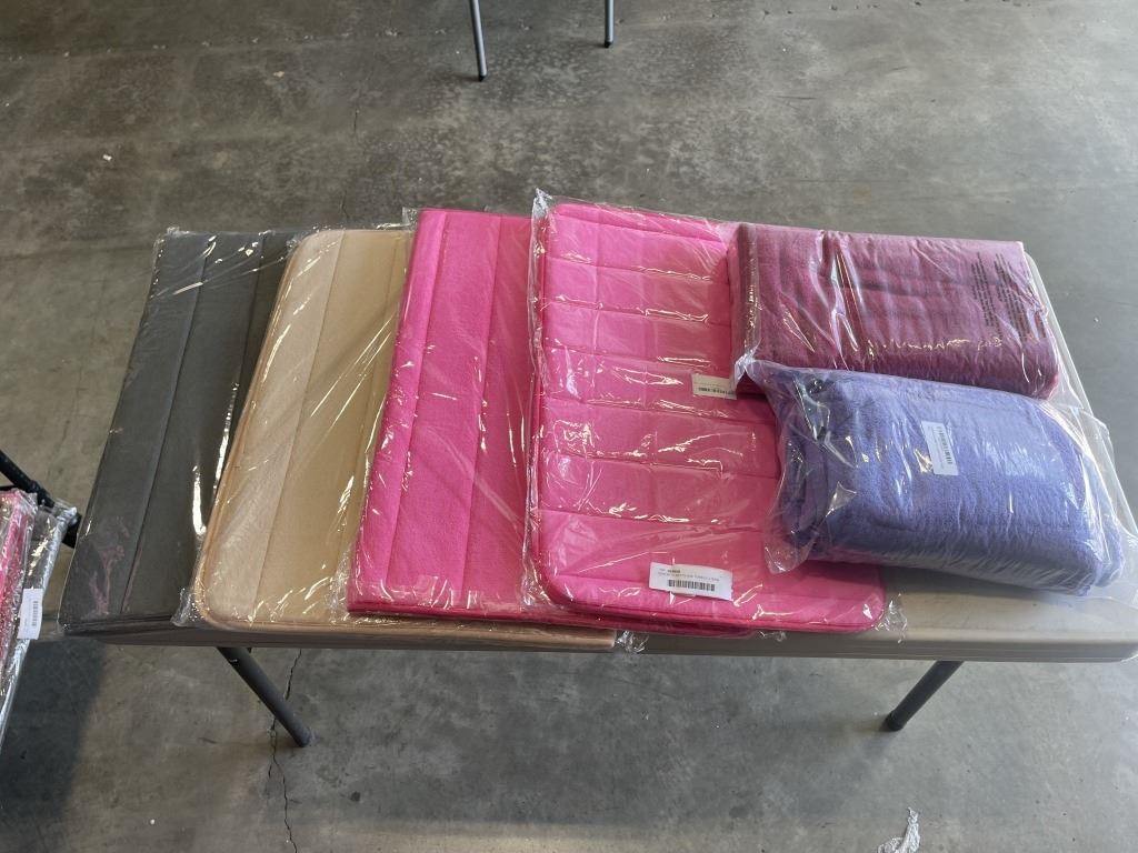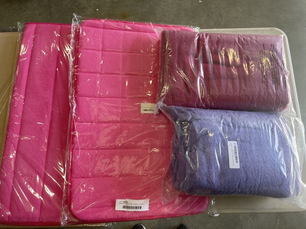 NEW BATH MATTS AND TOWELS, 2 28X56 INCH BATH TOWELS, 1 40X70 BEACH TOWEL, 2 23.5 X 35.5 SOFT FOAM BATGH MATTS, 1 19.5X31.5 SOFT FOAM BATH MATT AND 1 15.5X23.5 FOAM BATH MATT