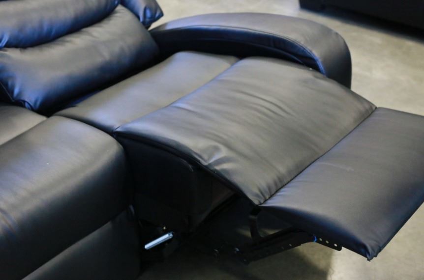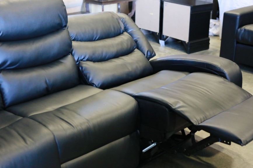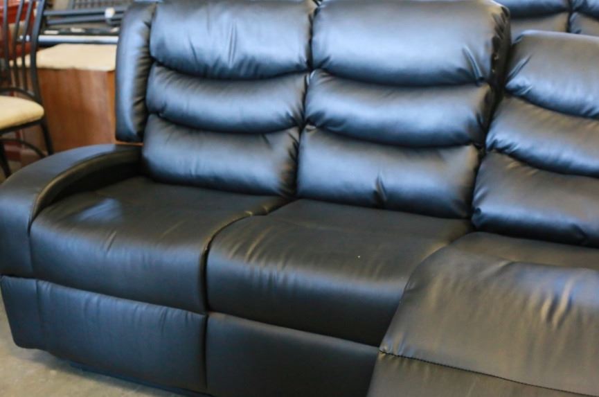 NEW BLACK LEATHER MODERN DOUBLE RECLINING SOFA, WITH REMOVABLE BACKS. RETAIL $1899