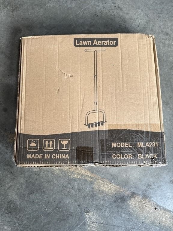 NEW BLACK METAL LAWN AERATOR, MODEL MLA231 INCLUDES PADDED HANDLES AND SET OF WORK GLOVES