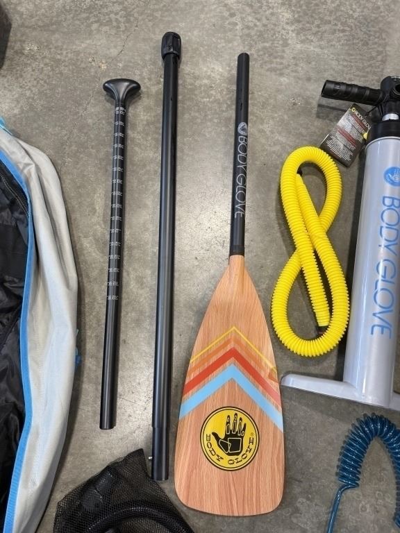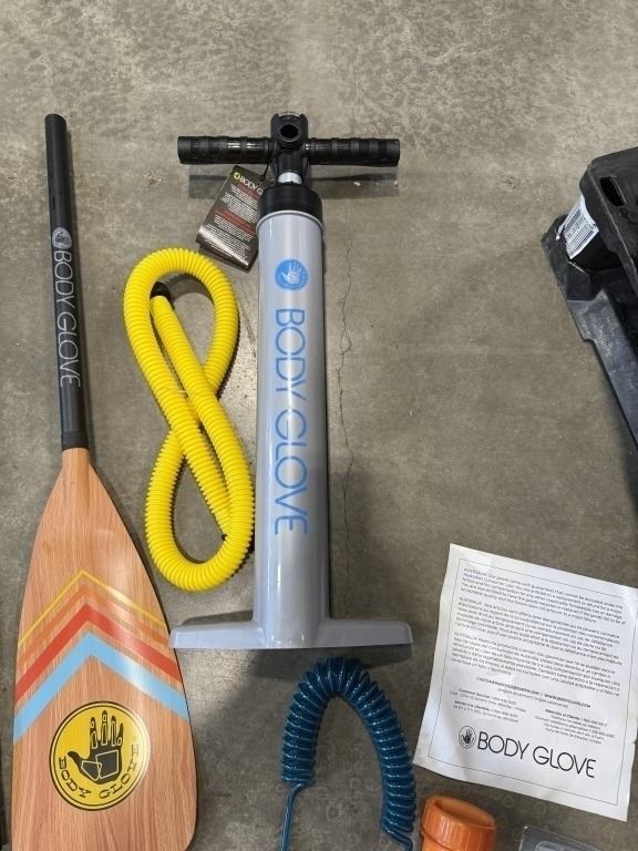 NEW BODY GLOVE PADDLE BOARD ACCESSORIES, INCLUDING BACKPACK CARRY BAG, 3PC ADJUSTABLE PADDLE, ELECTRIC PUMP WITH ACCESSORIES AND MANUAL PUMP, DRY POUCH, LEASH AND REPAIR KIT, PADDLE BOARD NMOT INCLUDED