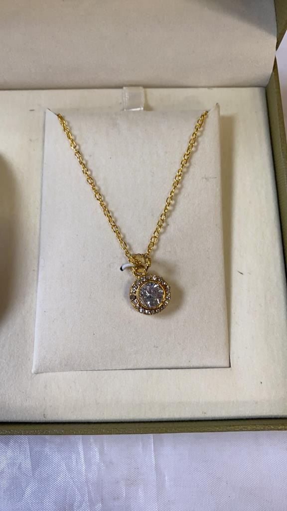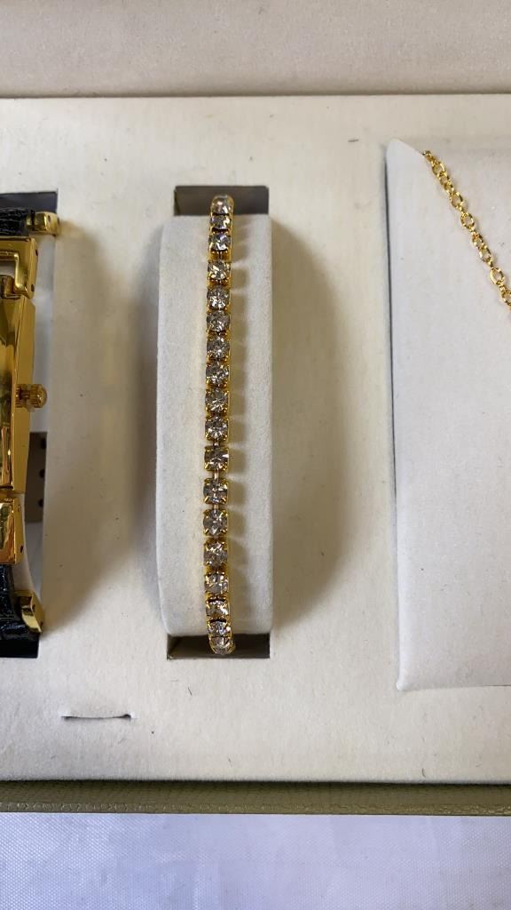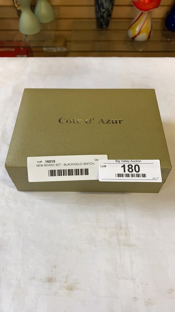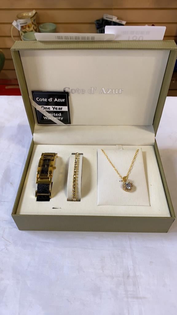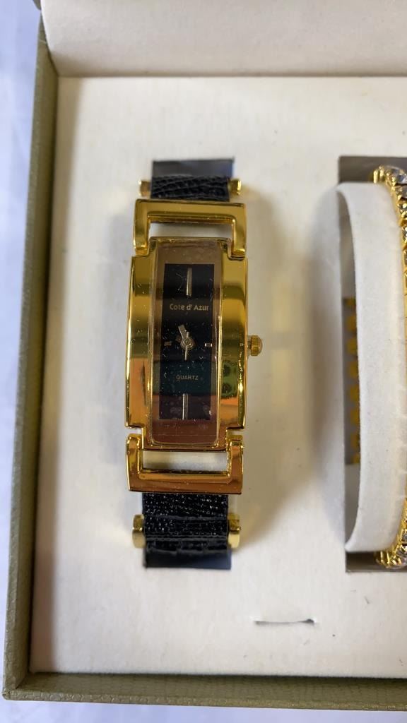 NEW BOXED SET - BLACK/GOLD WATCH, DIAMANTE BRACELET, AND NECKLACE BY COTE D'AZUR