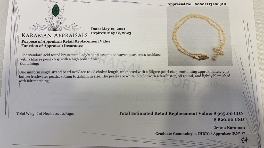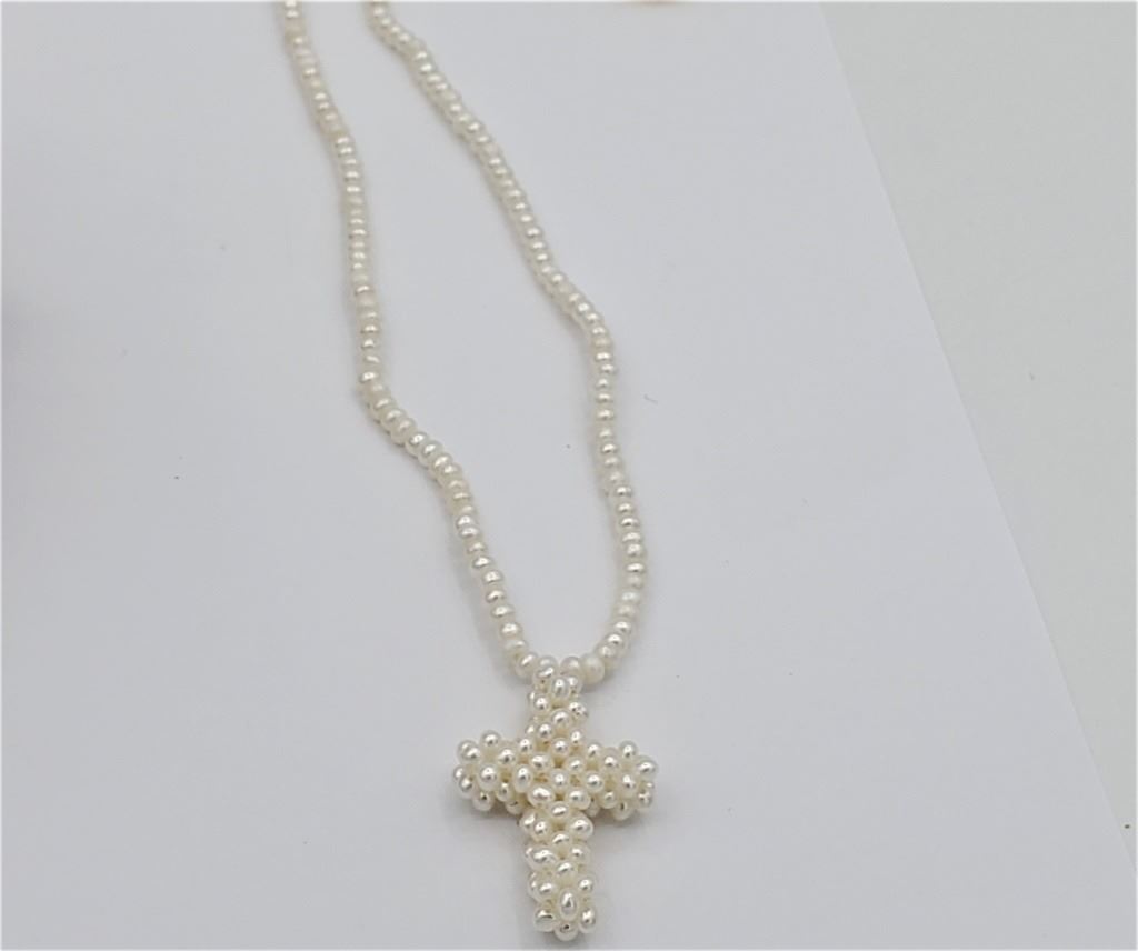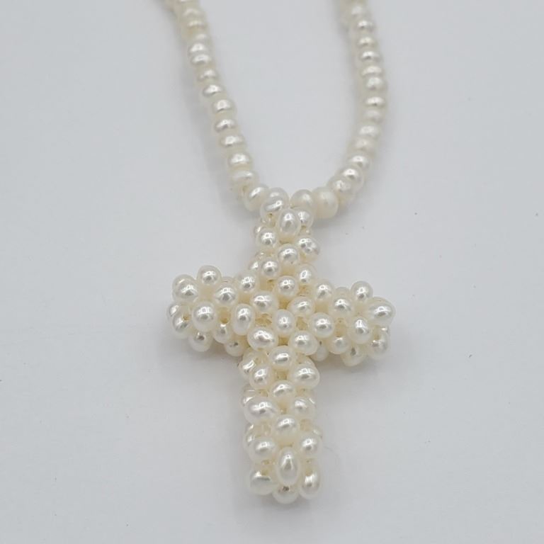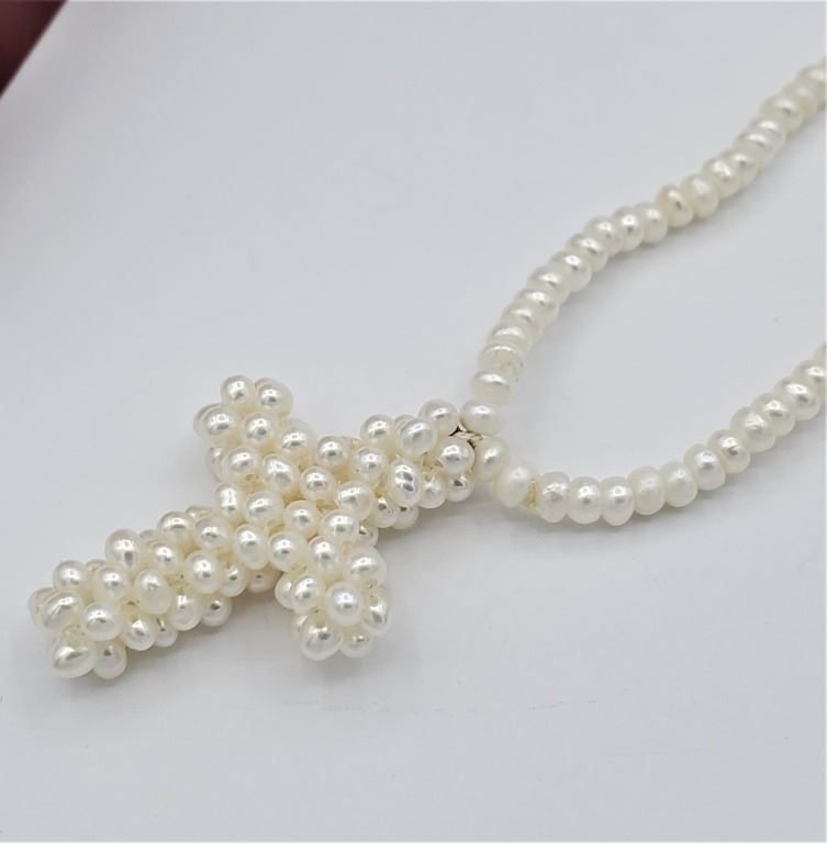 NEW BRASS GENUINE FRESHWATER PEARL CROSS NECKLACE W/ APPRAISAL $995