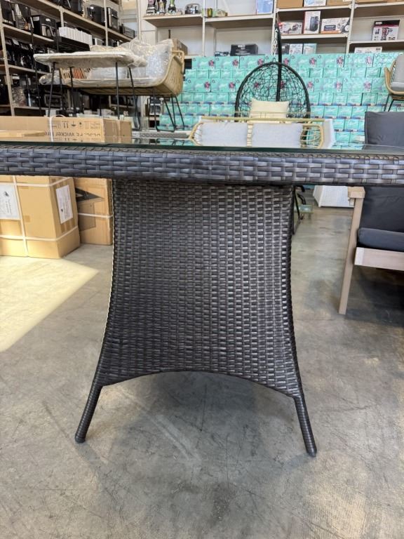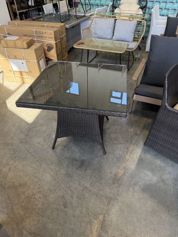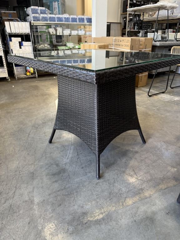 NEW BROWN RATTAN PATIO TABLE, ALUMINUM FRAME, PE RATTAN, TEMPERED GLASS TOP, RETAIL $499