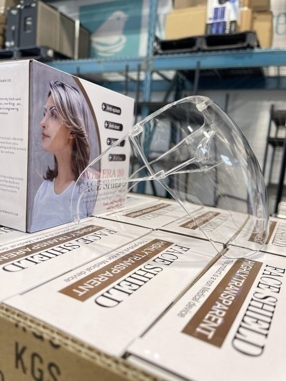 NEW CASE OF 10 PROTECTIVE SHIELD FACE MASKS, HIGH QUALITY, RETAIL $19.99 EACH