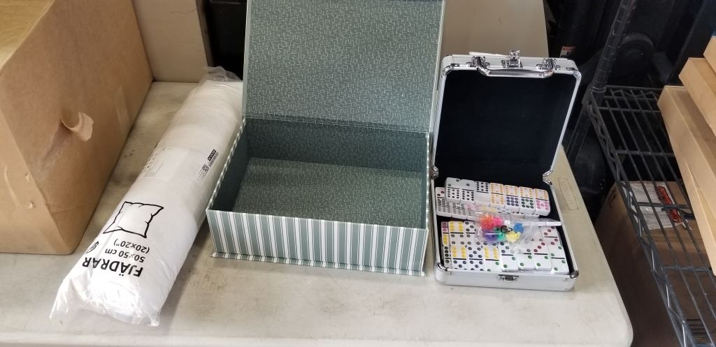 NEW CASED MEXICAN TRAIN DOMINOS, IKEA FJADRAR 20X20 INCH PILLOW, DECORATIVE BOX