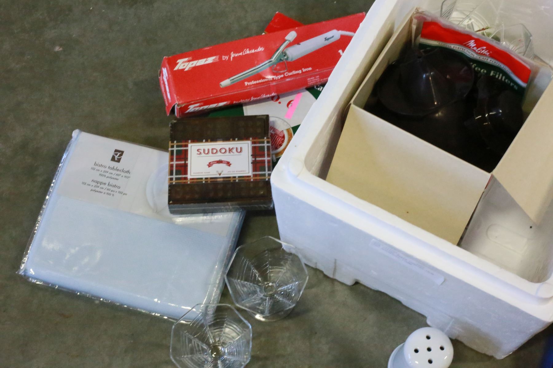 NEW COFFEE MAKER CURLING IRON AND HOSUEHOLD ITEMS