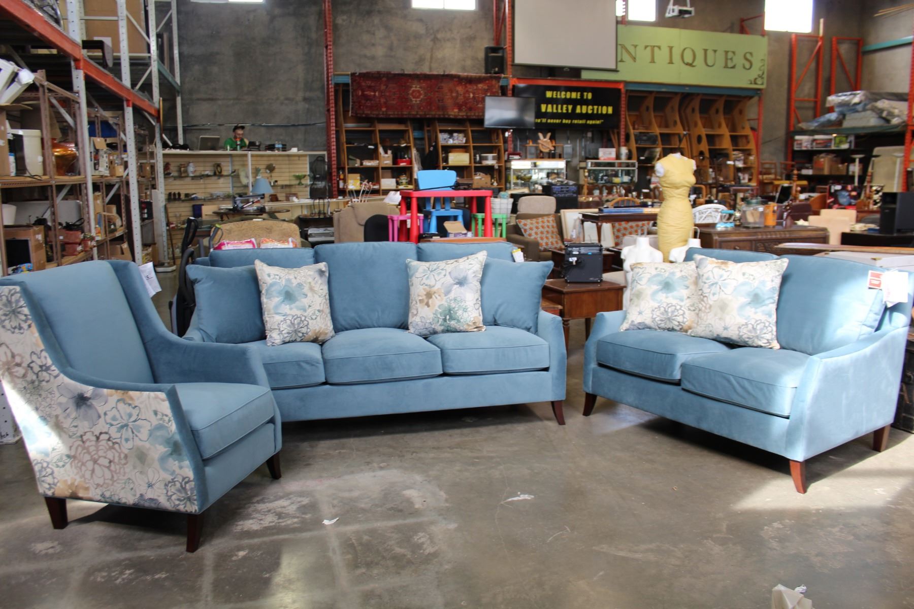 NEW COMFORTLAND 3 PIECE FABRIC AND FEATHER DOWN SOFA, LOVESEAT AND CHAIR, WITH THROW PILLOWS, RETAIL