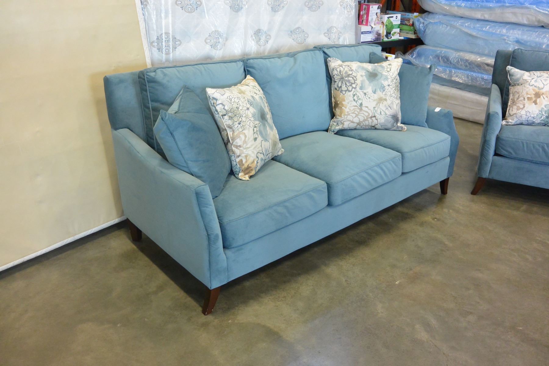 NEW COMFORTLAND 3 PIECE FABRIC AND FEATHER DOWN SOFA, LOVESEAT AND CHAIR, WITH THROW PILLOWS, RETAIL $3699