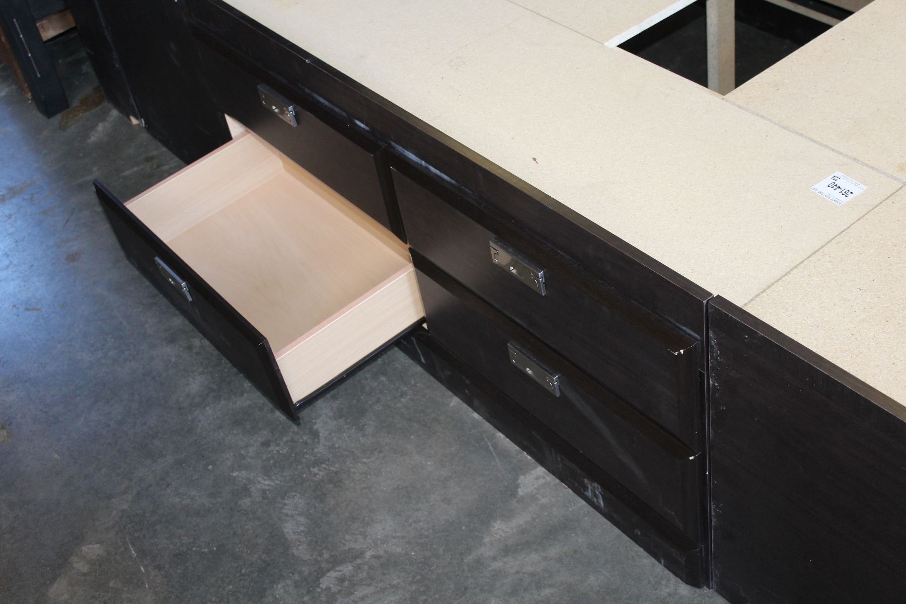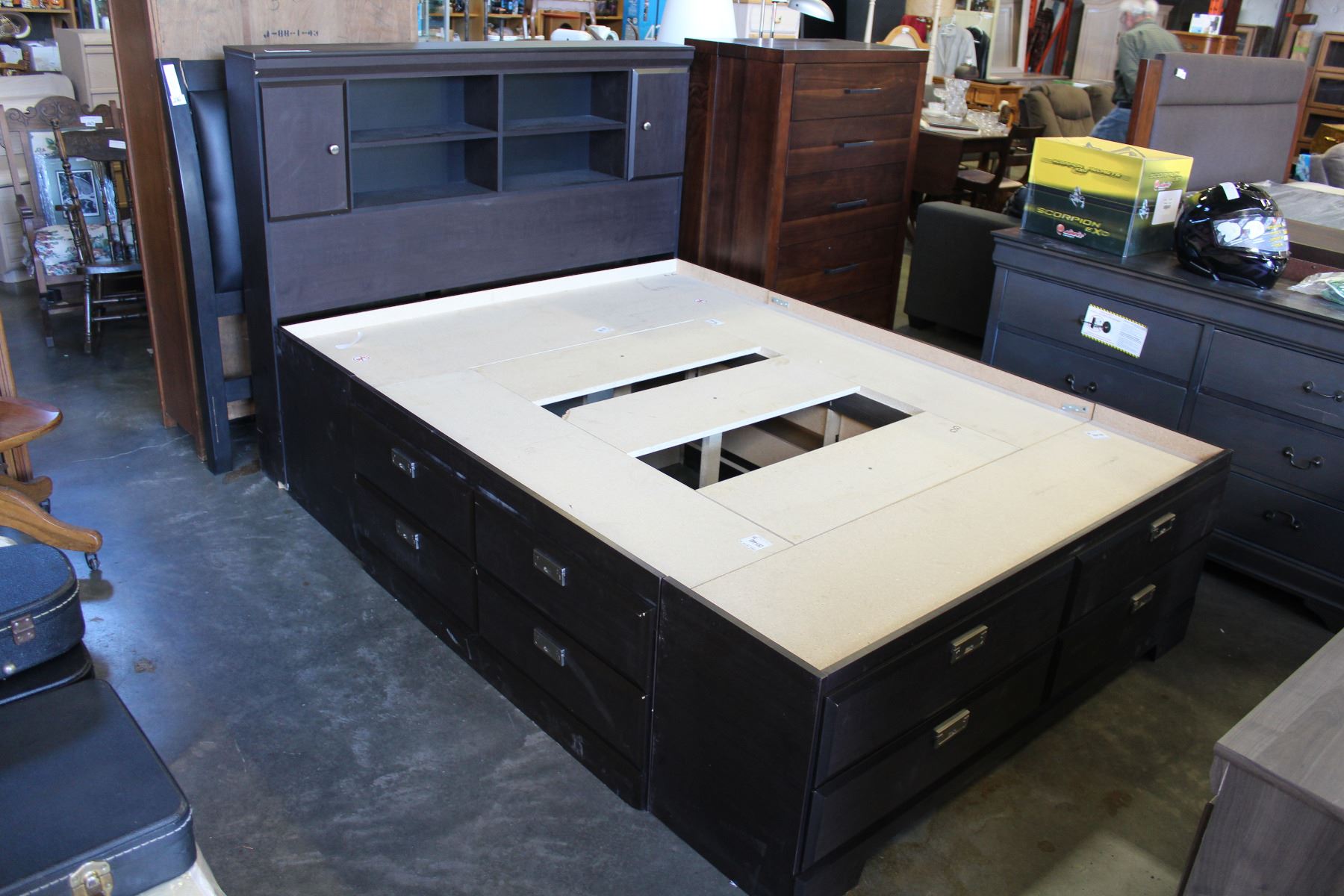 NEW DYNAMIC FURNITURE CYPRESS QUEEN STORAGE BEDFAME WITH BOOKCASE HEADBOARD, AND 12 UNDER BED STORAGE DRAWERS, RETAIL $1899
