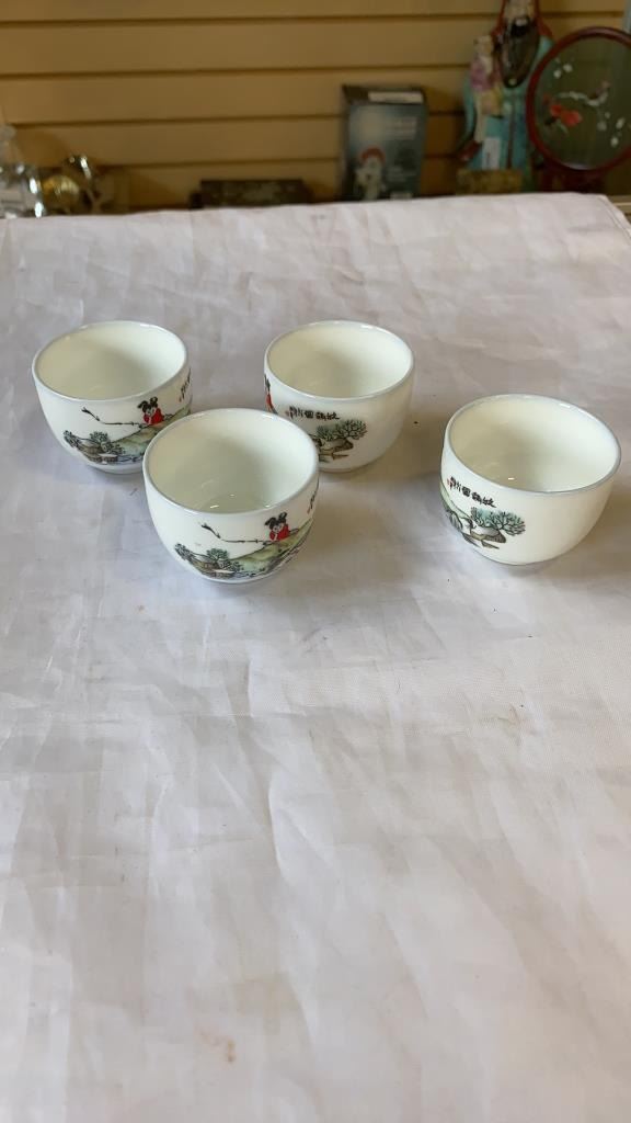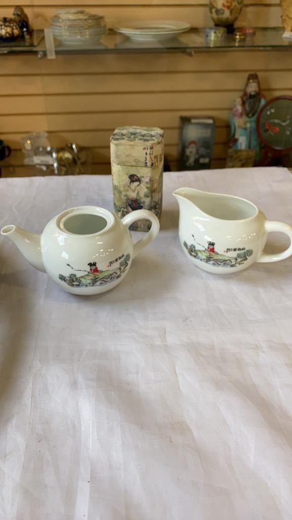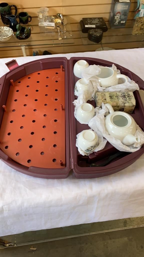 NEW EASTERN TEASET IN CASE AND SILK FRAMED PICTURE ON STAND
