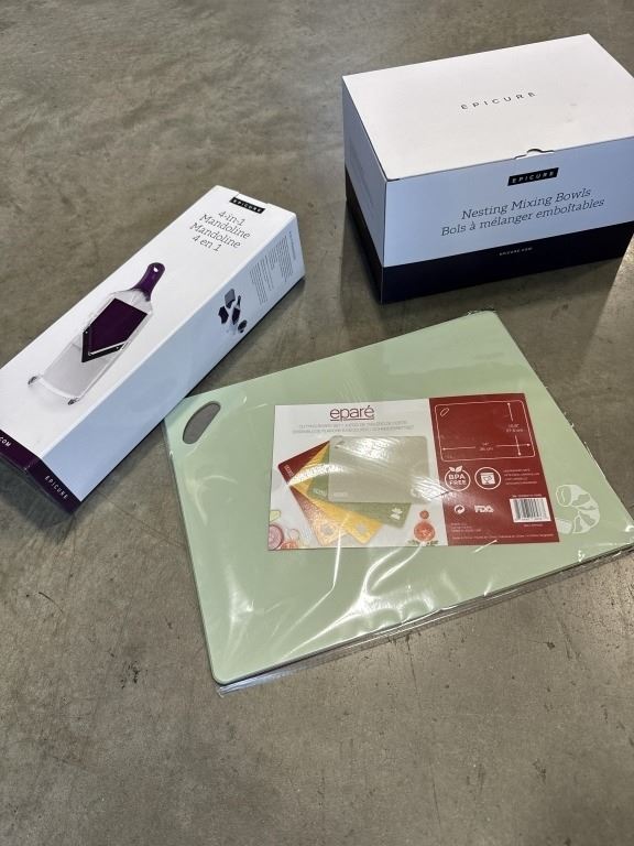 NEW EPICURE MANDOLINE SLICER, 4PC CUTTING BOARD SET, AND EPICURE 3PC LARGE MIXING BOWL SET, 2 / 4 / 6 CUP