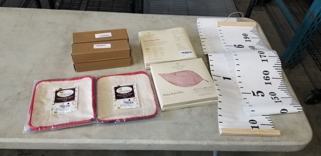 NEW FLANNEL BABY WIPES, 2 PACKS OF 15, 4 NEW SETS OF 4 BABY BURP BIBS, AND 5 NEW MARIO KIDS GROWTH CHARTS