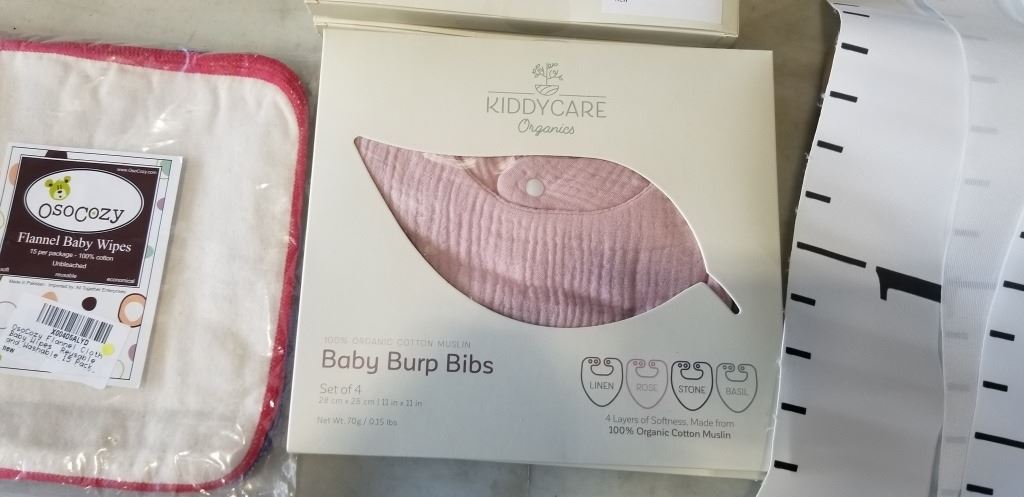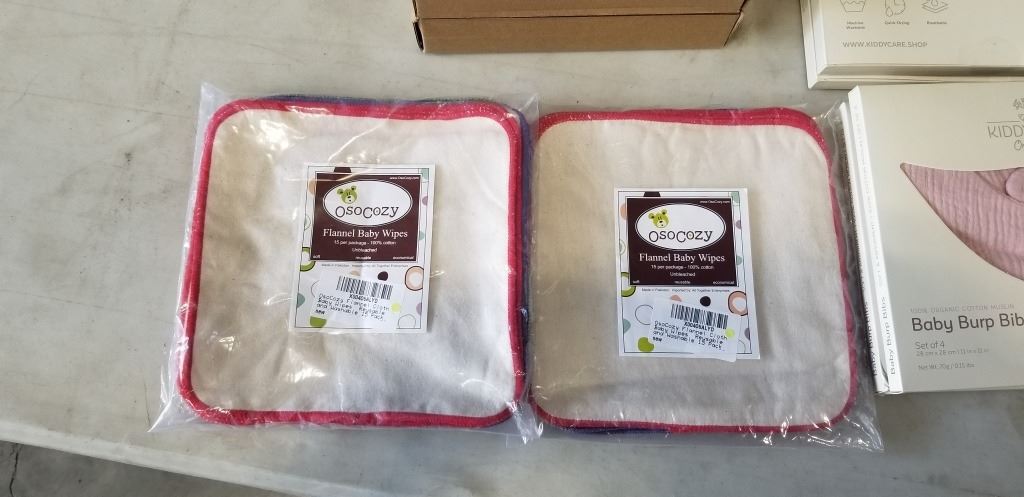NEW FLANNEL BABY WIPES, 2 PACKS OF 15, 4 NEW SETS OF 4 BABY BURP BIBS, AND 5 NEW MARIO KIDS GROWTH C