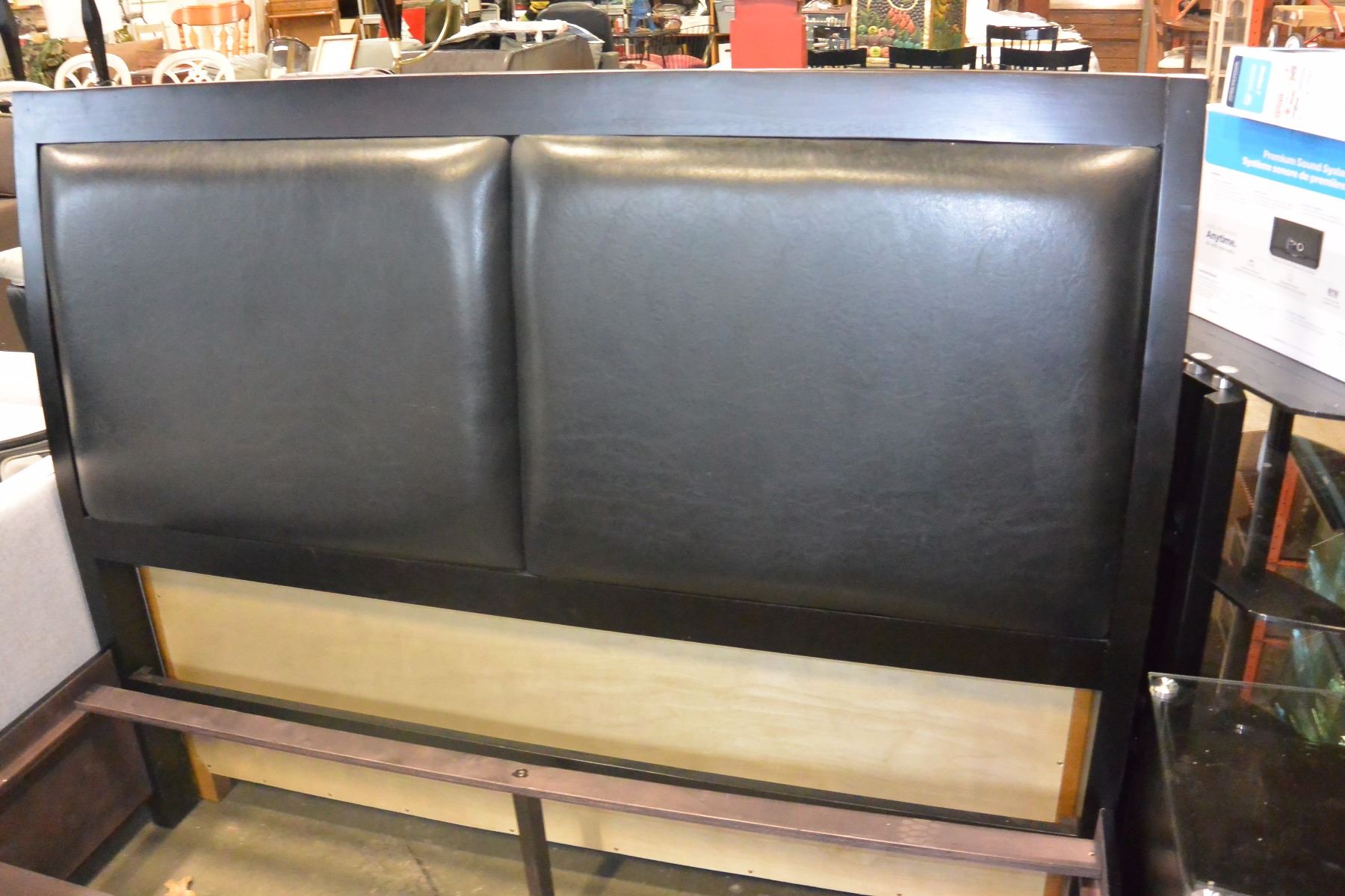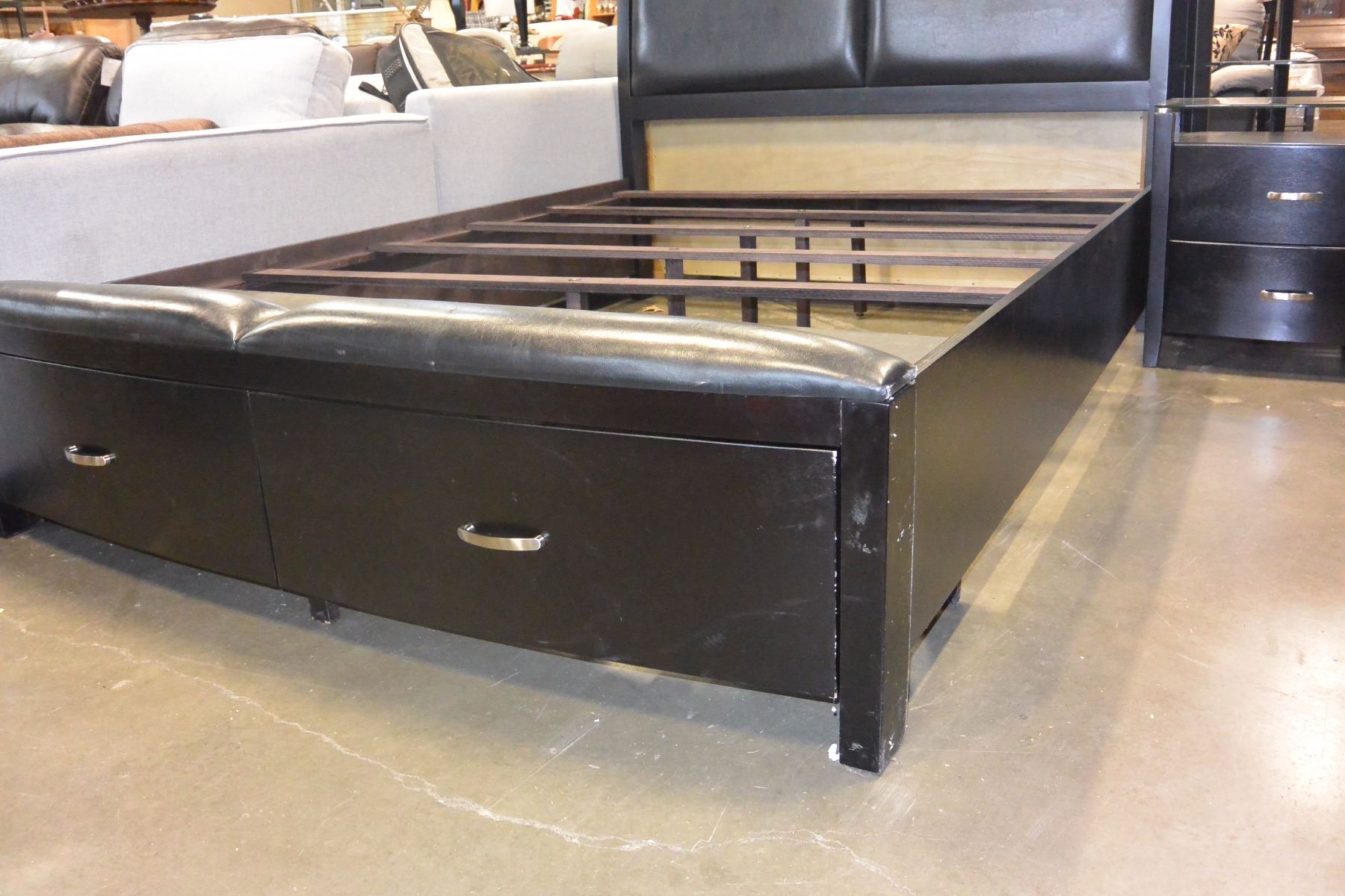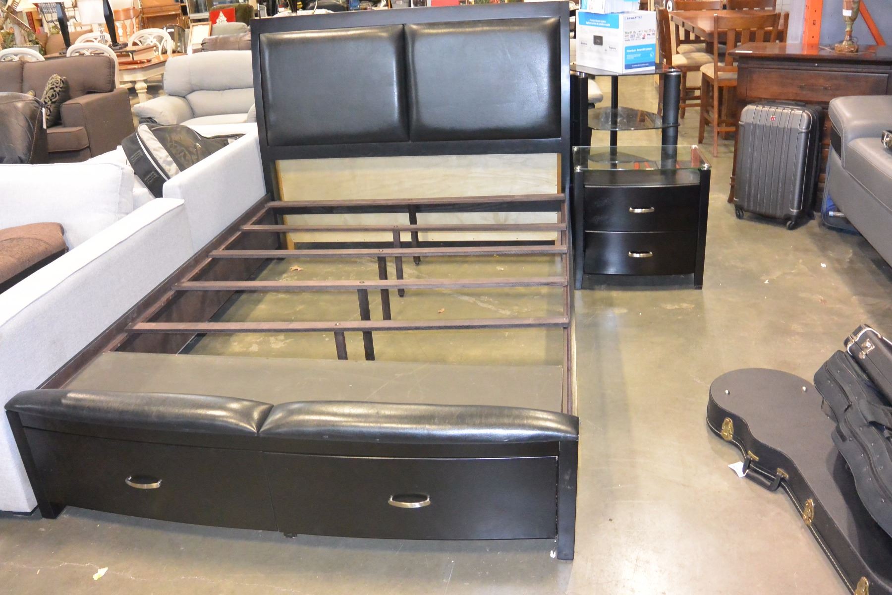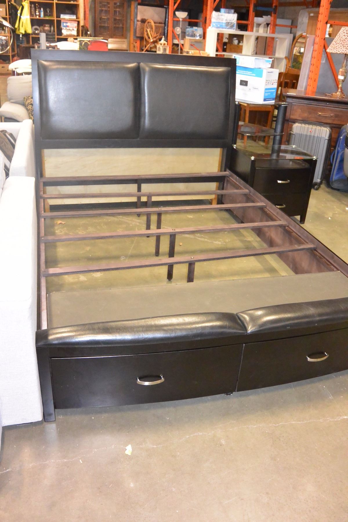 NEW FLOOR MODEL QUEENSIZE MODERN BEDFRAME WITH TWO STORAGE DRAWERS AND LEATHER INSET HEADBOARD, RETAIL $1899