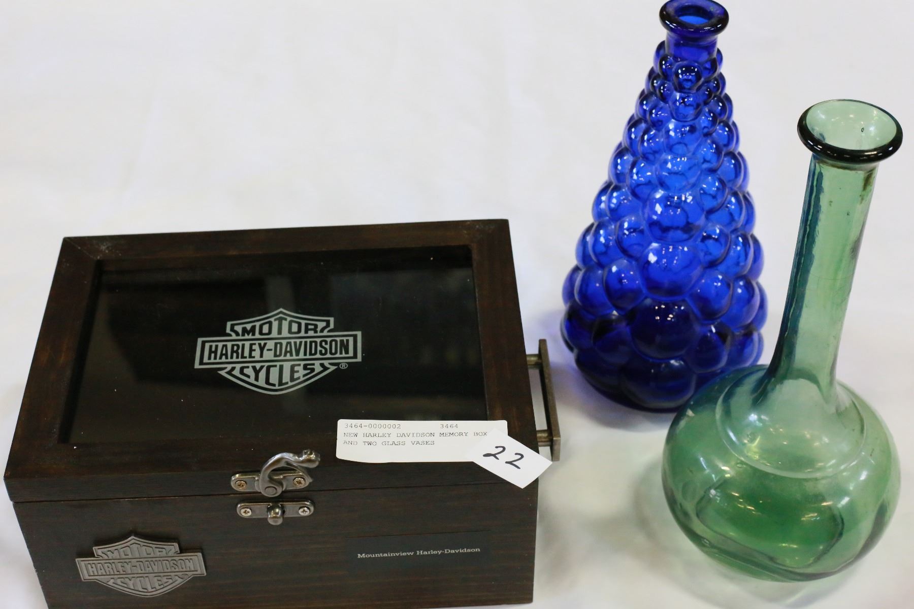 NEW HARLEY DAVIDSON MEMORY BOX AND TWO GLASS VASES