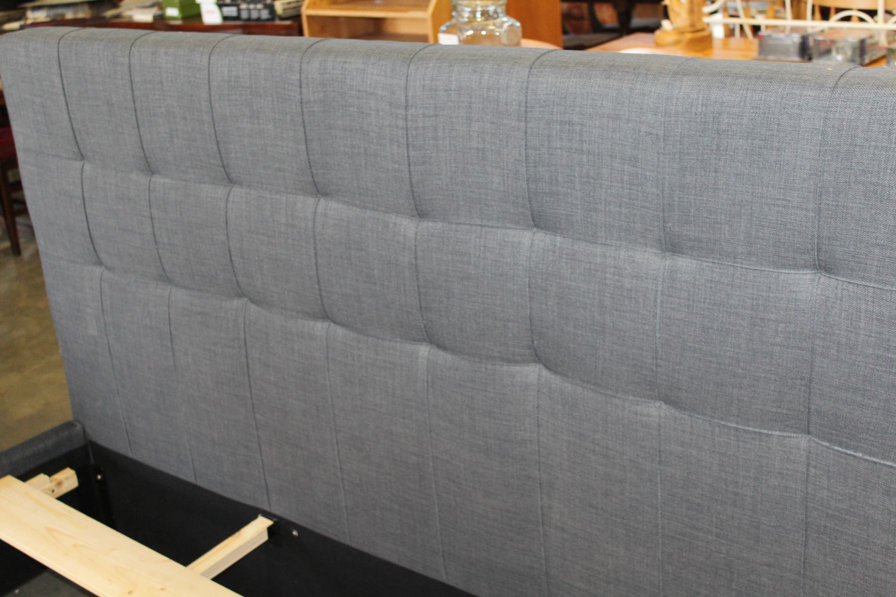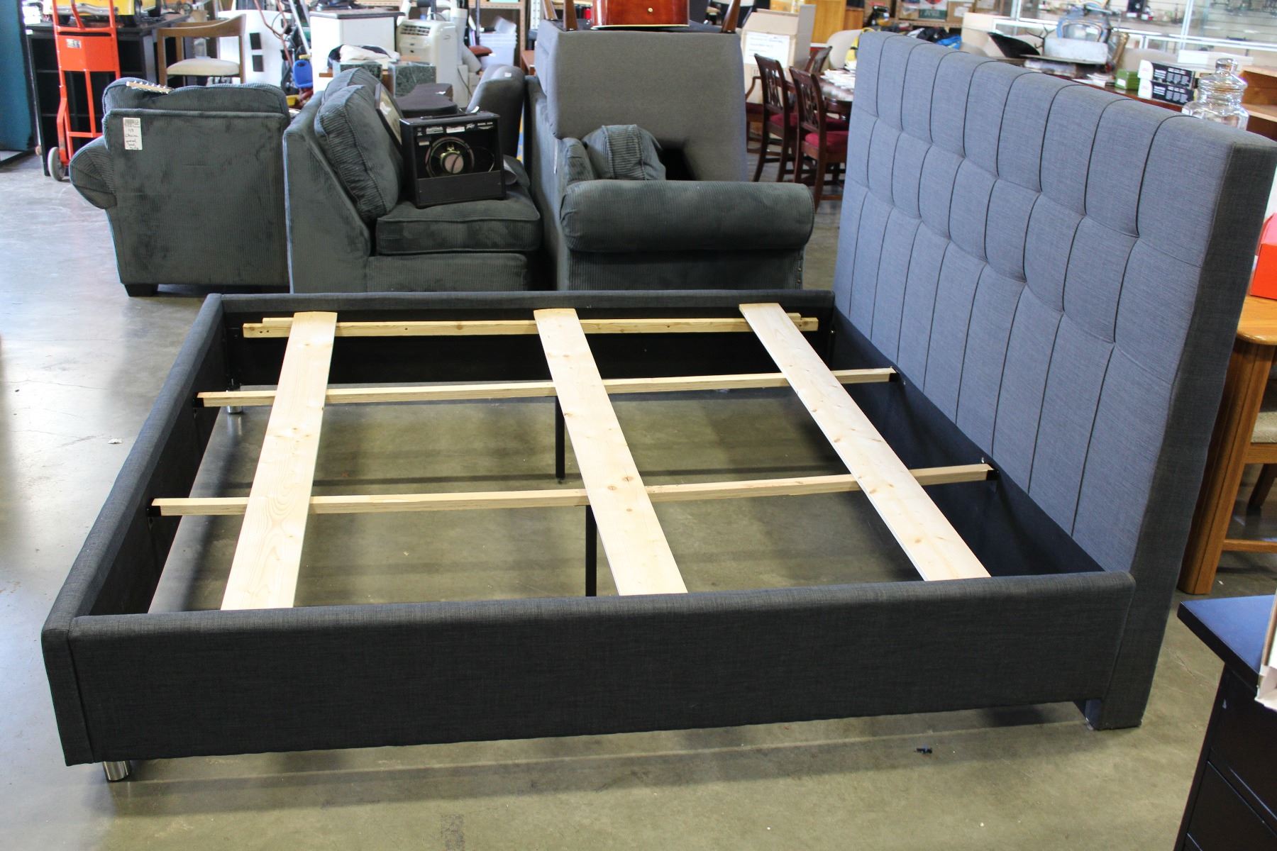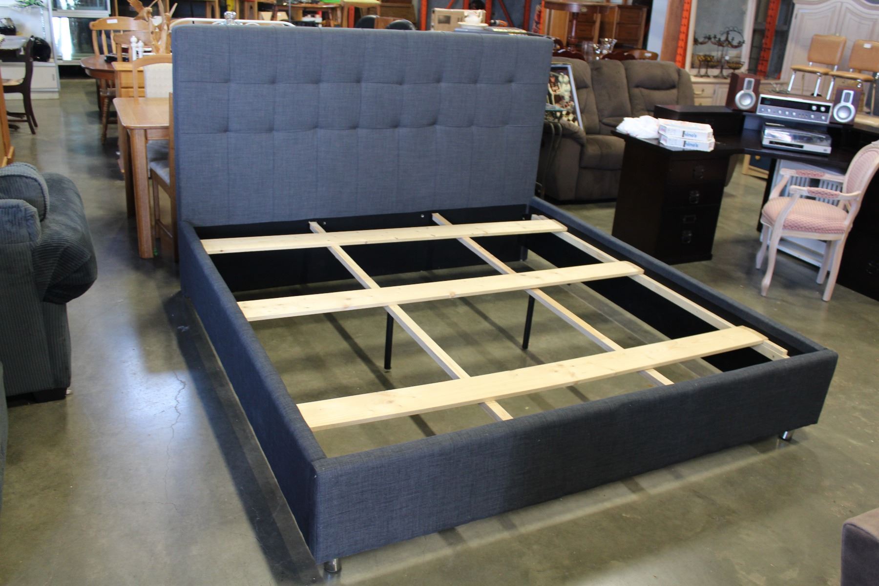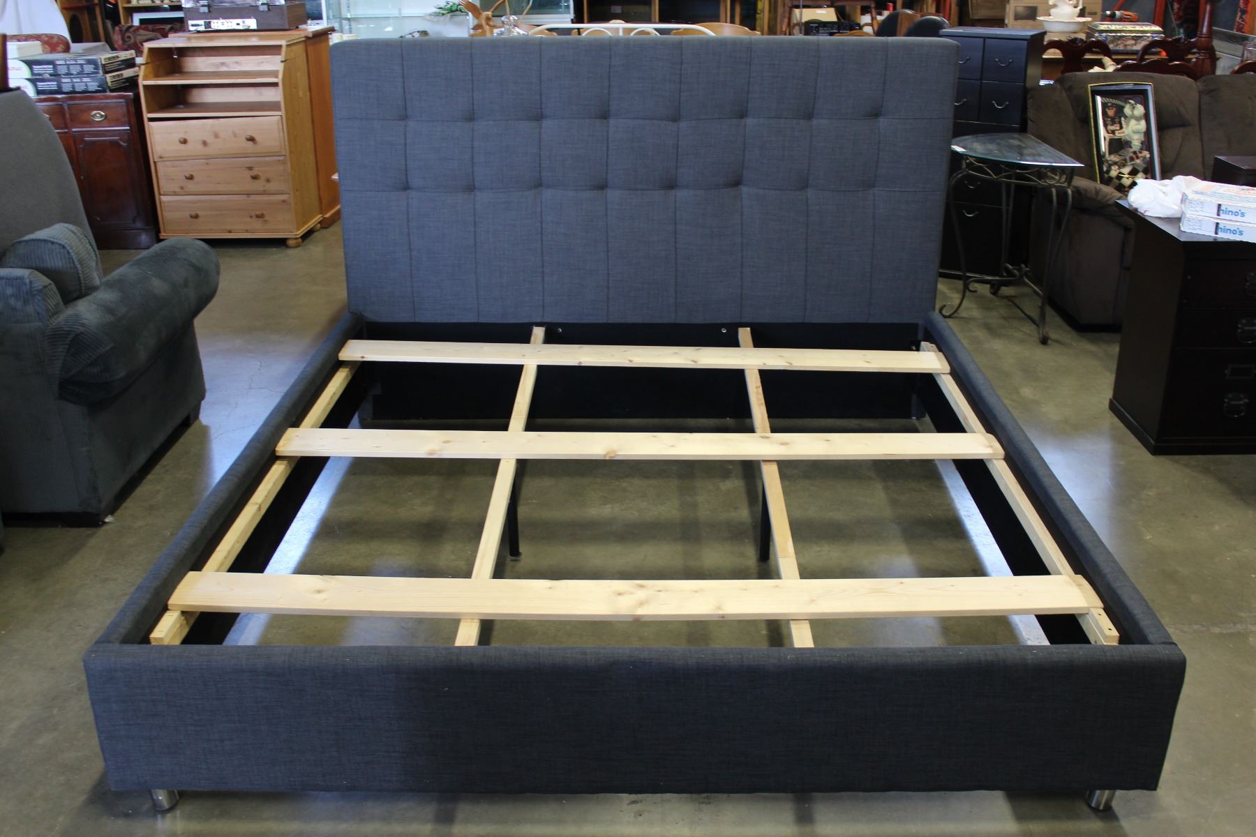 NEW HOME ELEGANCE FLOOR MODEL MODERN KINGSIZE GREY PLATFORM BEDFRAME, RETAIL $1699