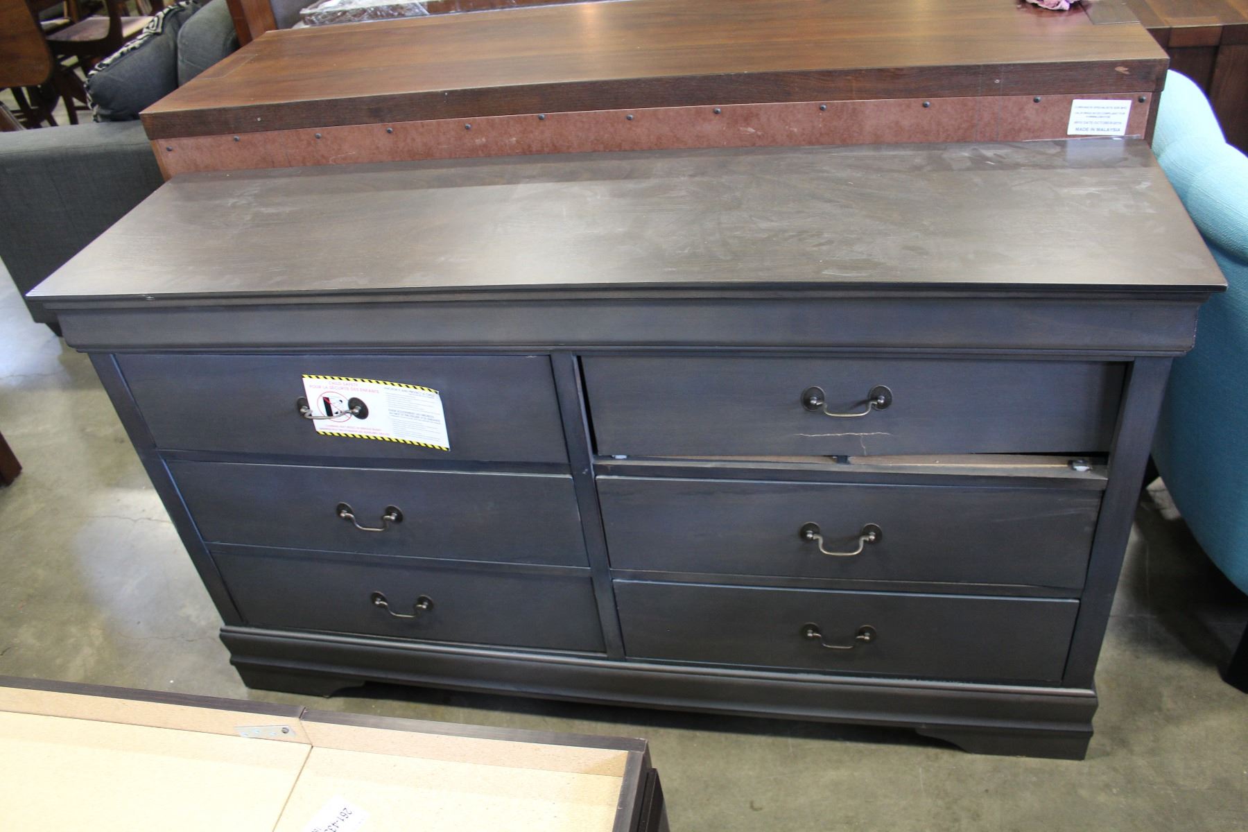 NEW HOME ELEGANCE GREY MODERN 6 DRAWER DRESSER, MINOR SHIPPING DAMAGE TO TOP RIGHT DRAWER, RETAIL $7
