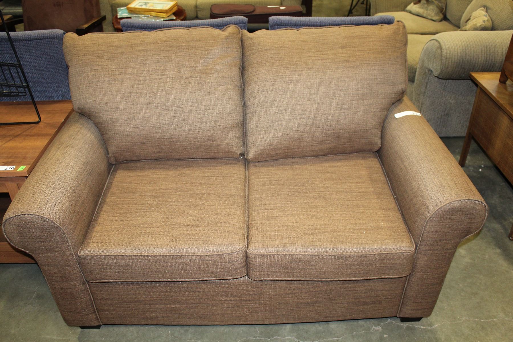 NEW HOME ELEGANCE MODDERN BROWN FABRIC PILLOW BACK LOVESEAT RETAIL $899