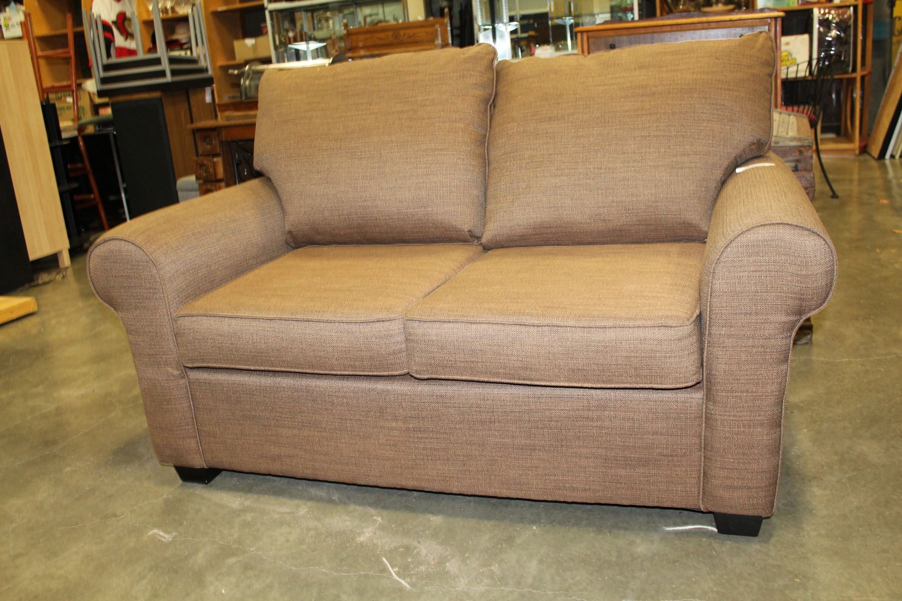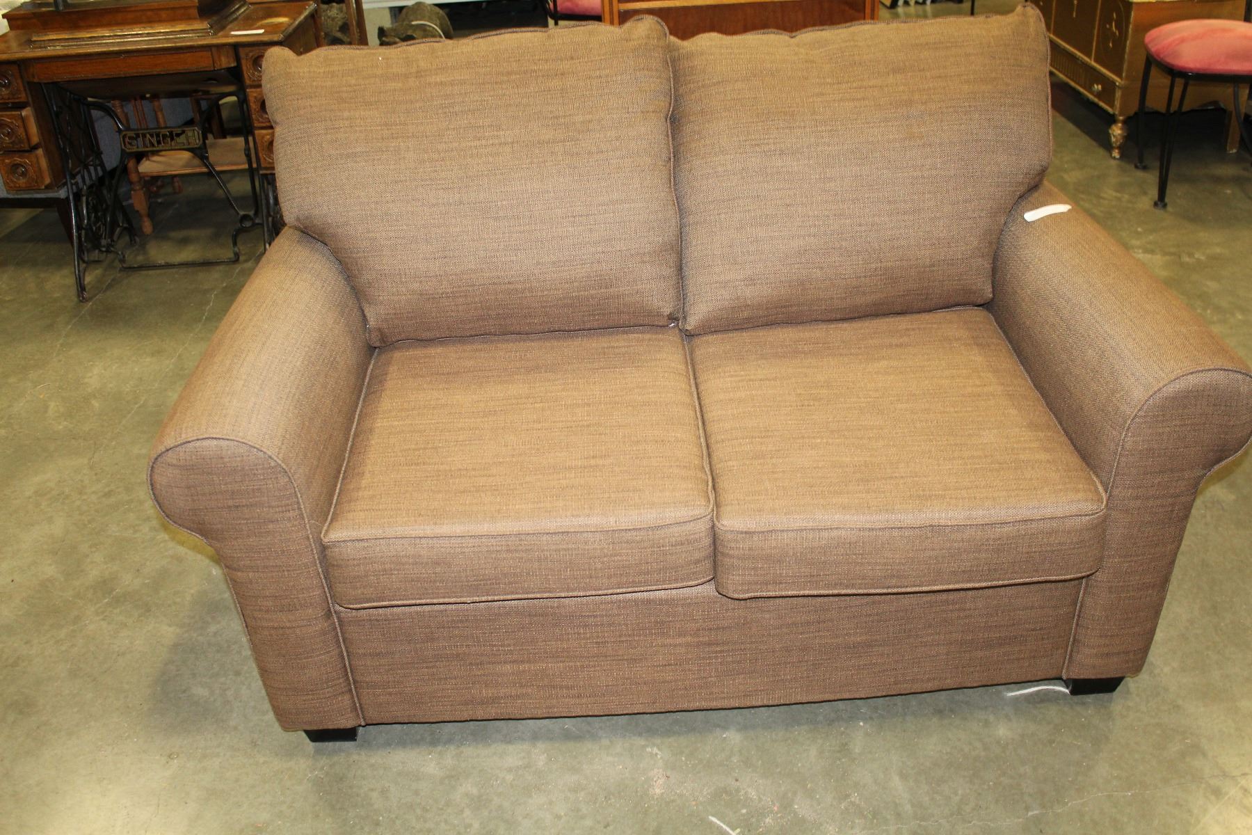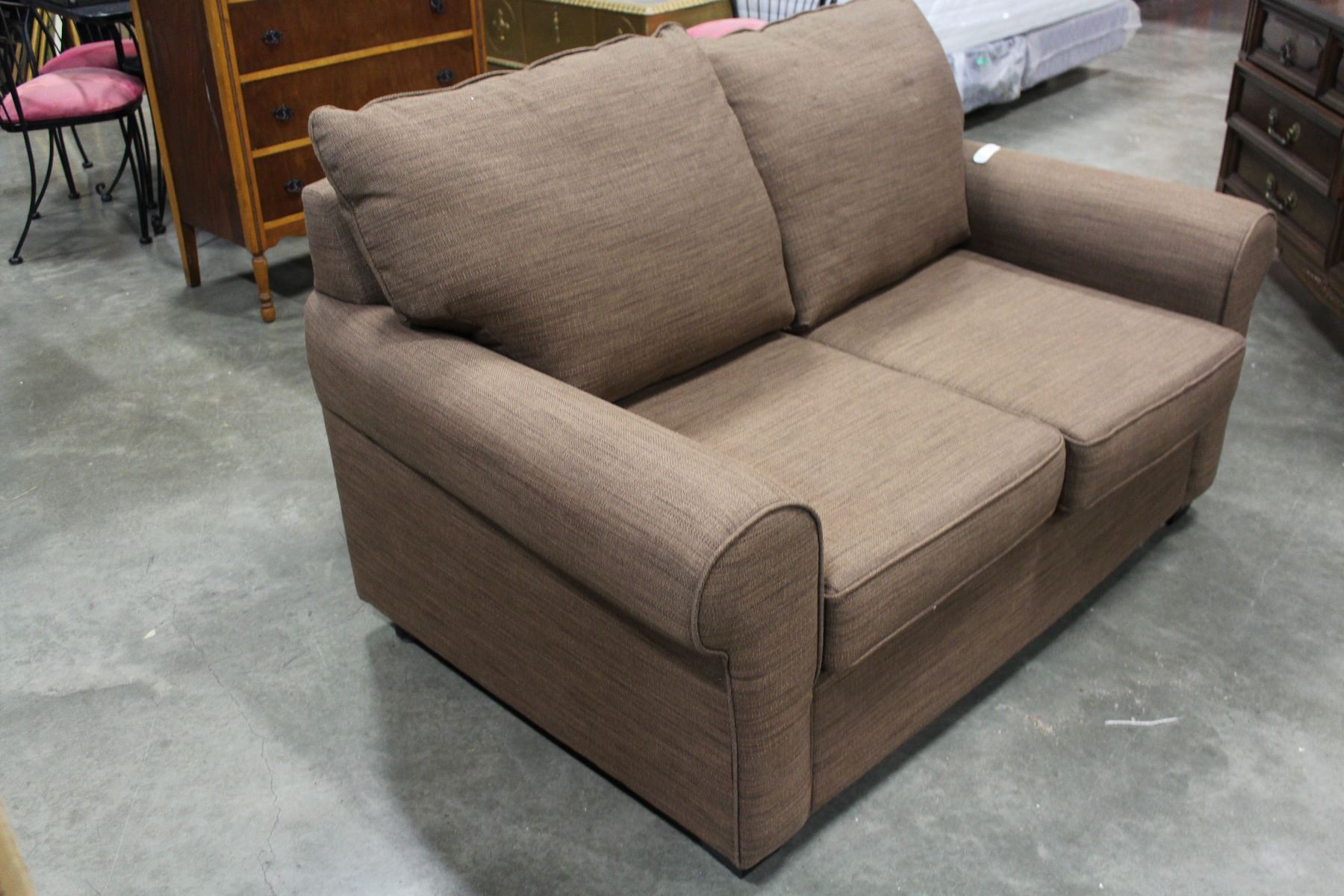 NEW HOME ELEGANCE MODDERN BROWN FABRIC PILLOW BACK LOVESEAT RETAIL $899