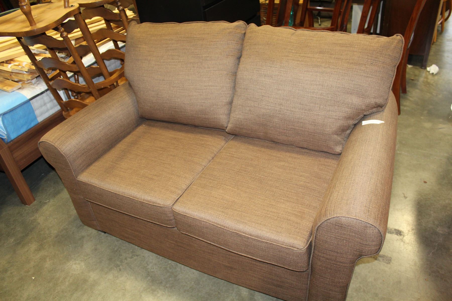 NEW HOME ELEGANCE MODDERN BROWN FABRIC PILLOW BACK LOVESEAT RETAIL $899