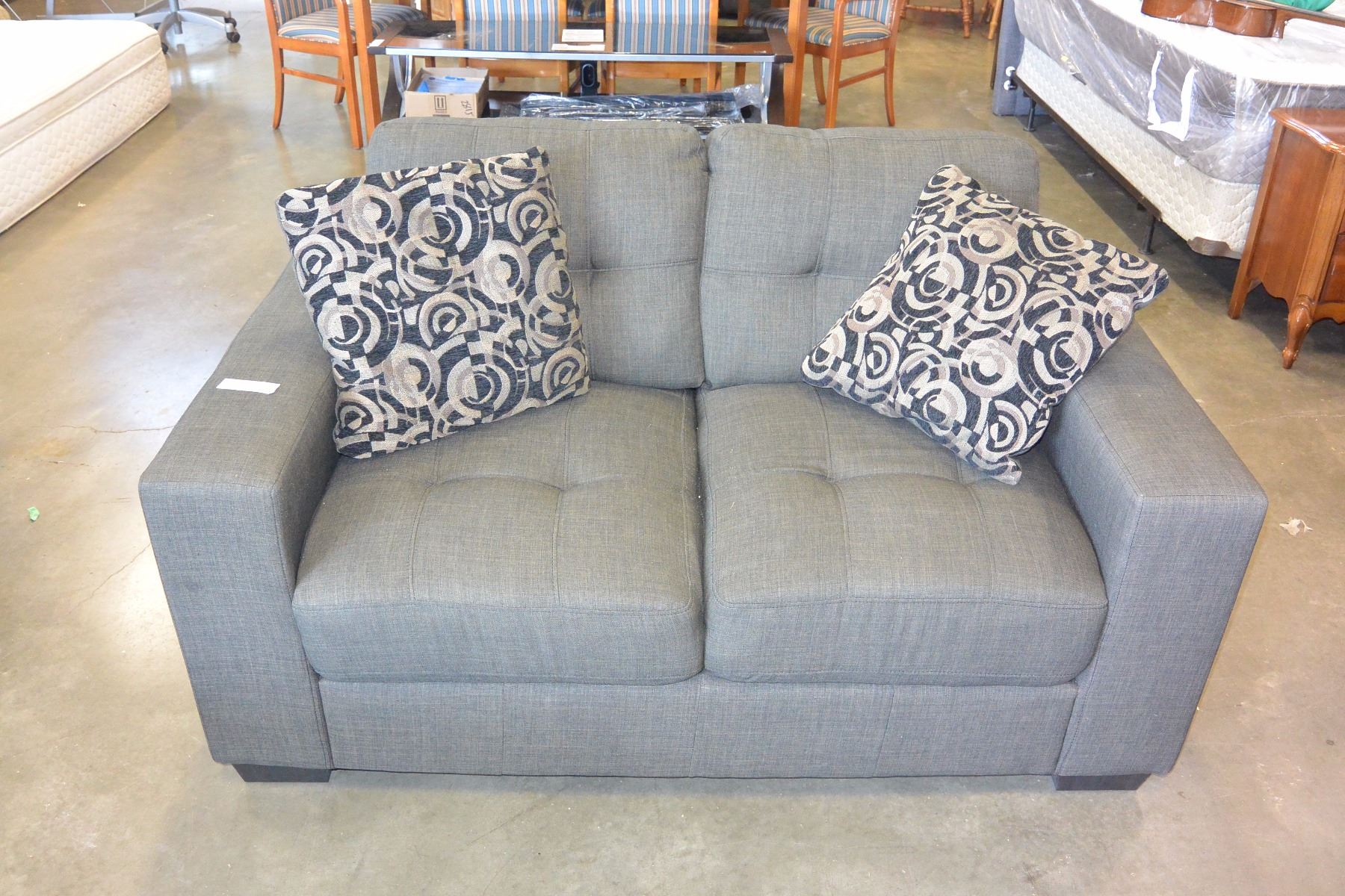 NEW HOME ELEGANCE MODERN GREY FABRIC LOVESEAT WITH TWO THROW PILLOWS RETAIL $699