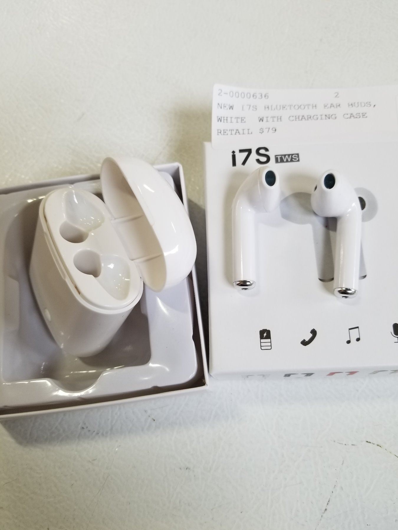 NEW I7S BLUETOOTH EAR BUDS, WHITE WITH CHARGING CASE RETAIL $79