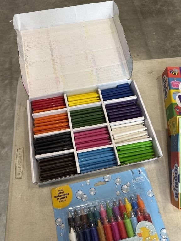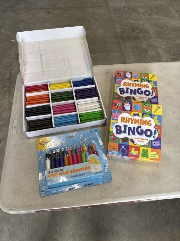 NEW IDIY 300PC UNWRAPPED SORTED 12 COLOR CRAYON SET, 2 NEW RHYMING BINGO GAMES, AND NEW SET OF BATHTUB CRAYONS