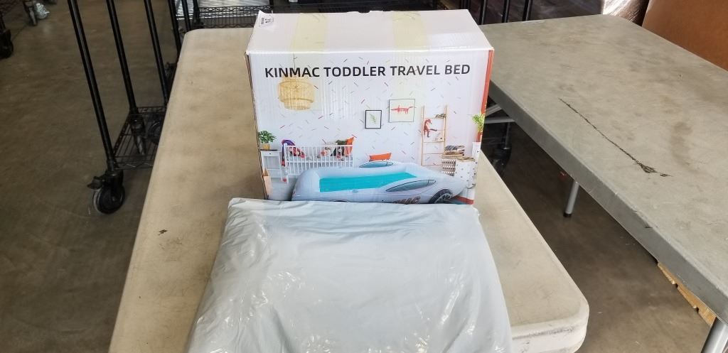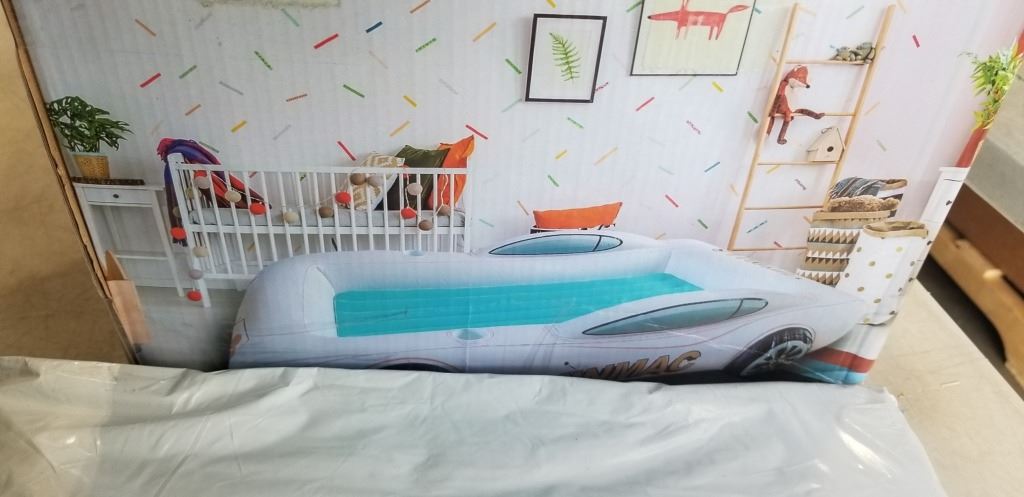 NEW INFLATABLE TODDLER RACE CAR AIR MATTRESS WITH ELECTRIC PUMP, AND NEW BACKPACK