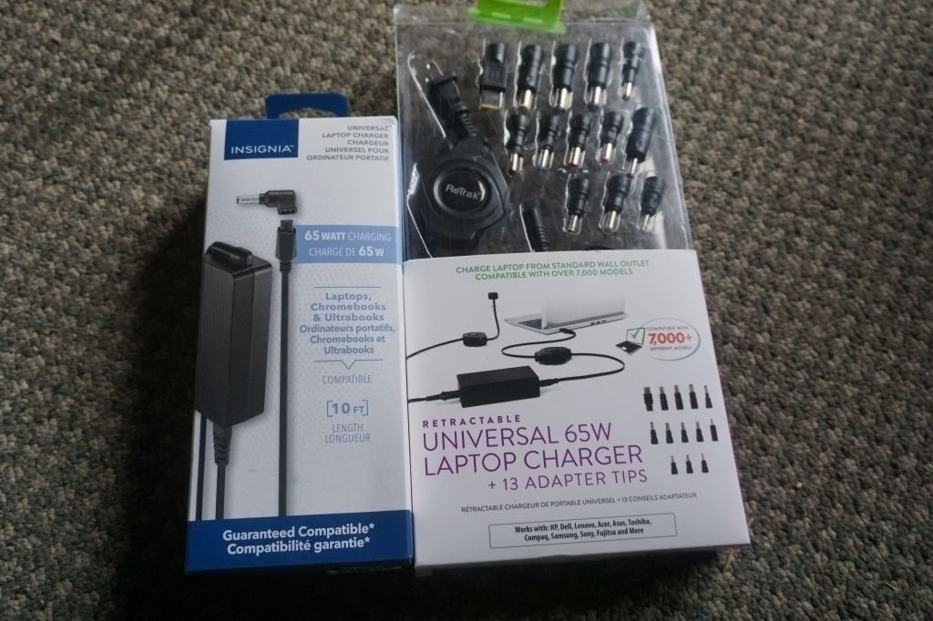 NEW INSIGNIA 65W UNIVERSAL LAPTOP CHARGER AND RETRAK 65W RETRACTABLE UNIVERSAL LAPTOP CHARGER WITH 13 TIPS RETAIL $120