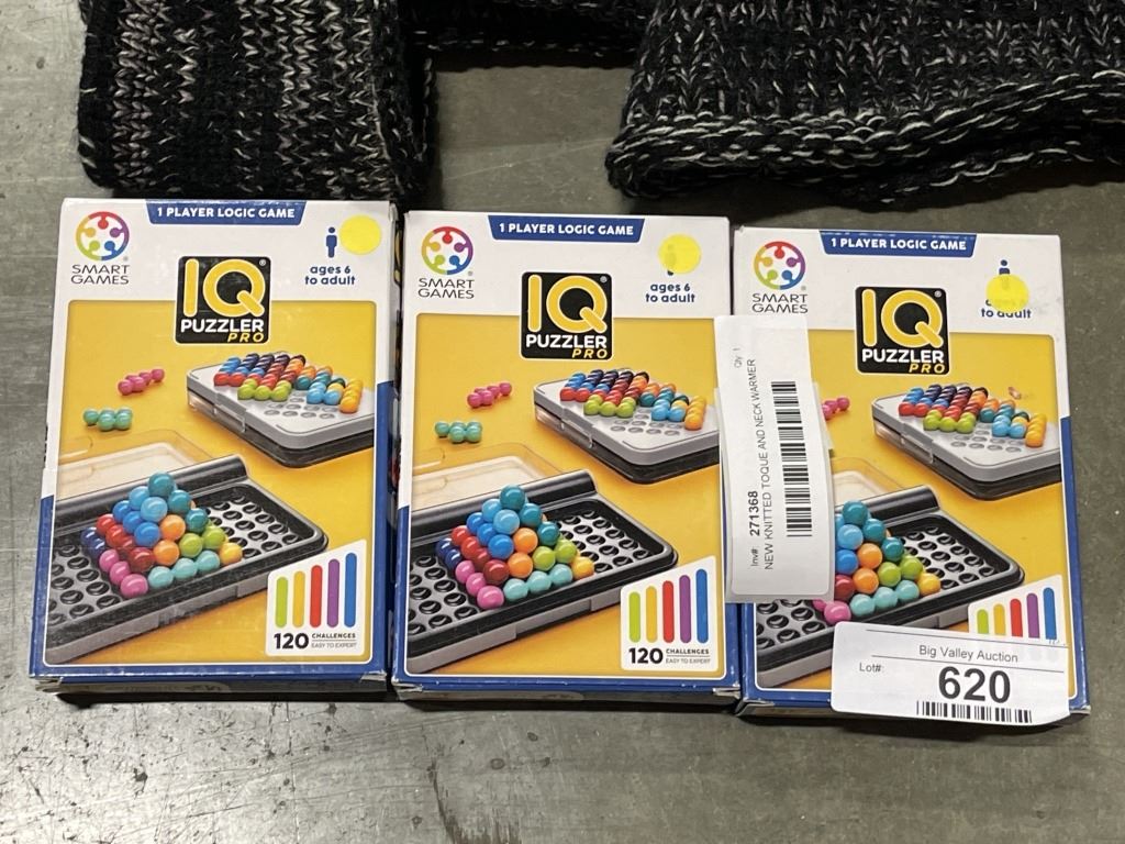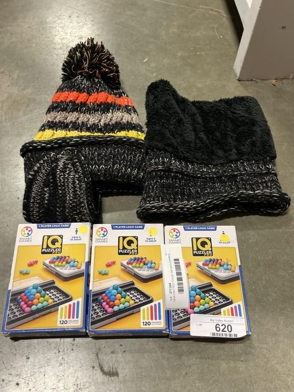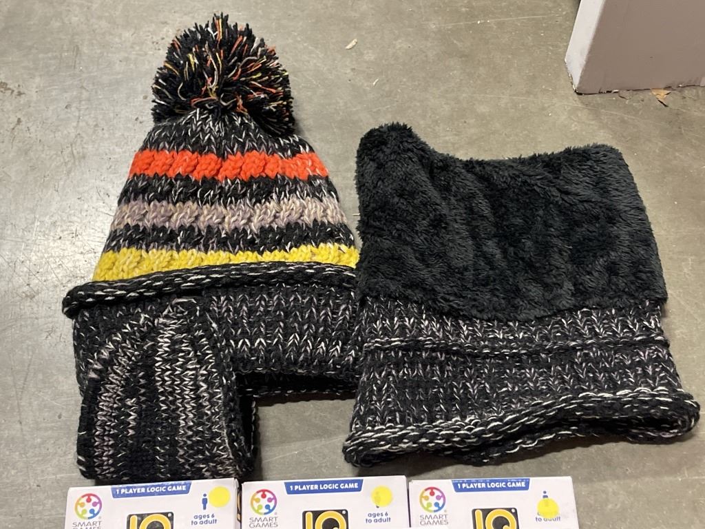 NEW KNITTED TOQUE AND NECK WARMER SET AND 3 NEW IQ PUZZLES