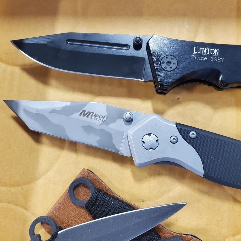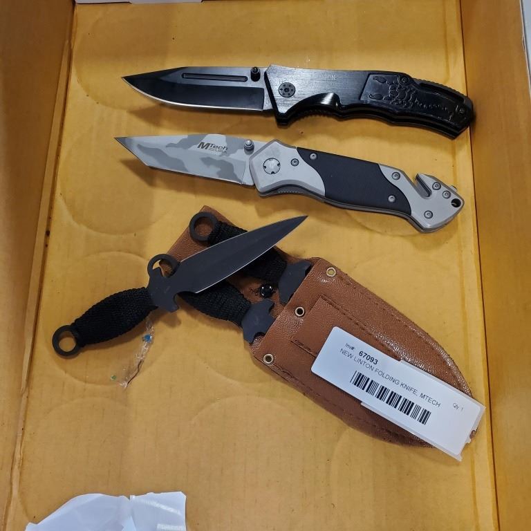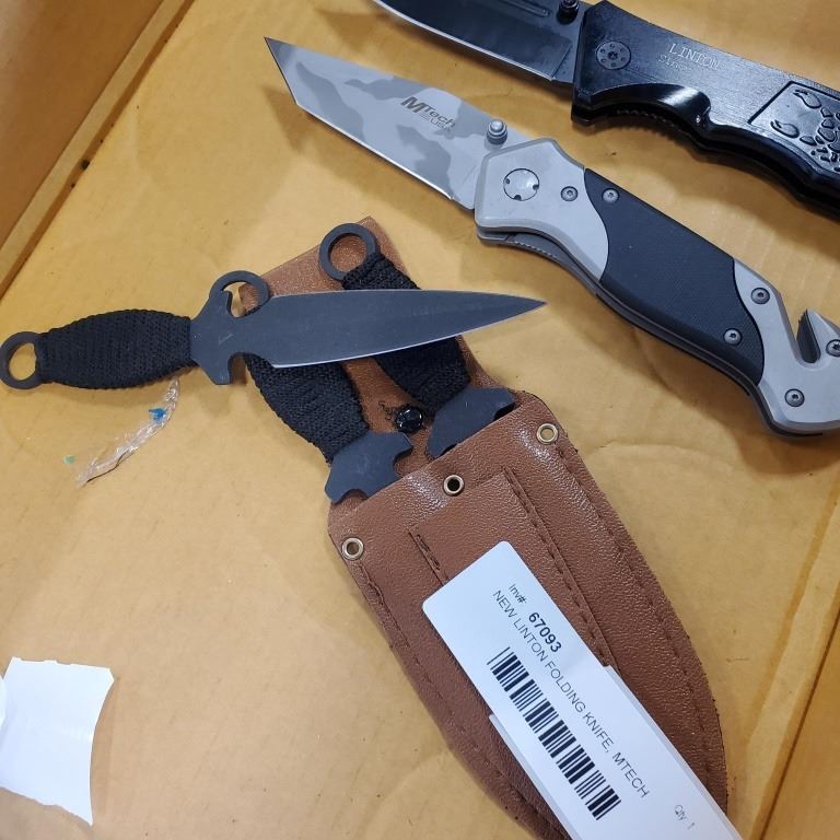 NEW LINTON FOLDING KNIFE, MTECH FOLDING KNIFE AND 3 NEW THROWING KNIVES