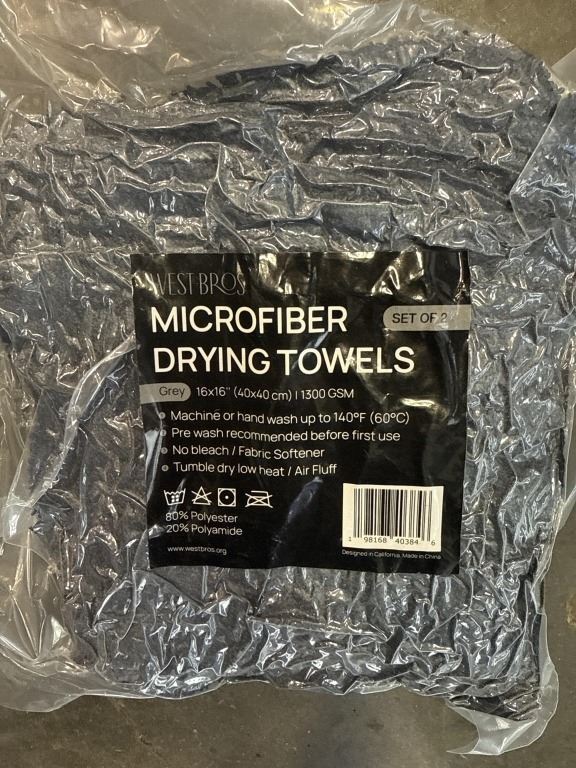 NEW MICROFIBRE DRYING TOWELS, 4 GREY 16 X 16 INCH, (PACKS OF 2) AND LARGE SIZE 2X BLUE 40 X 24 INCH