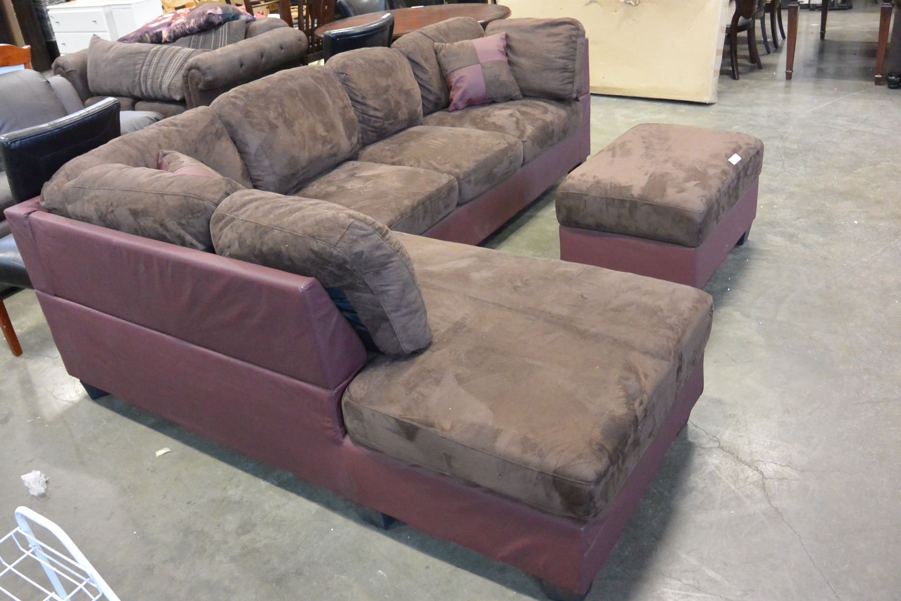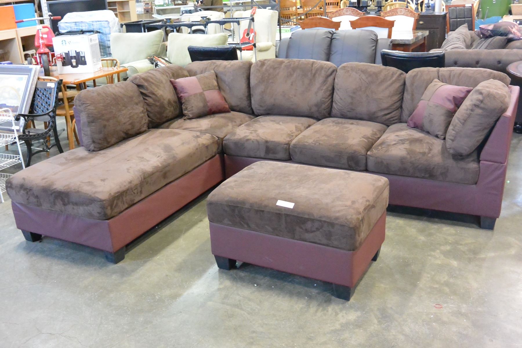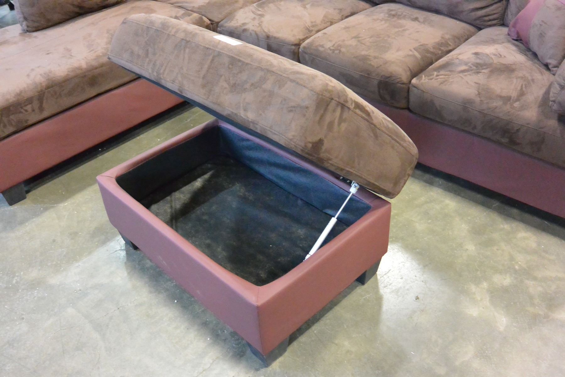 NEW MODERN 2 PIECE SECTIONAL WITH CHAISE, 2 TONE BRON MICROFIBRE COMFORTABLE SEATING, WITH THROW CUSHIONS AND STORAGE OTTOMAN, RETAIL $2899