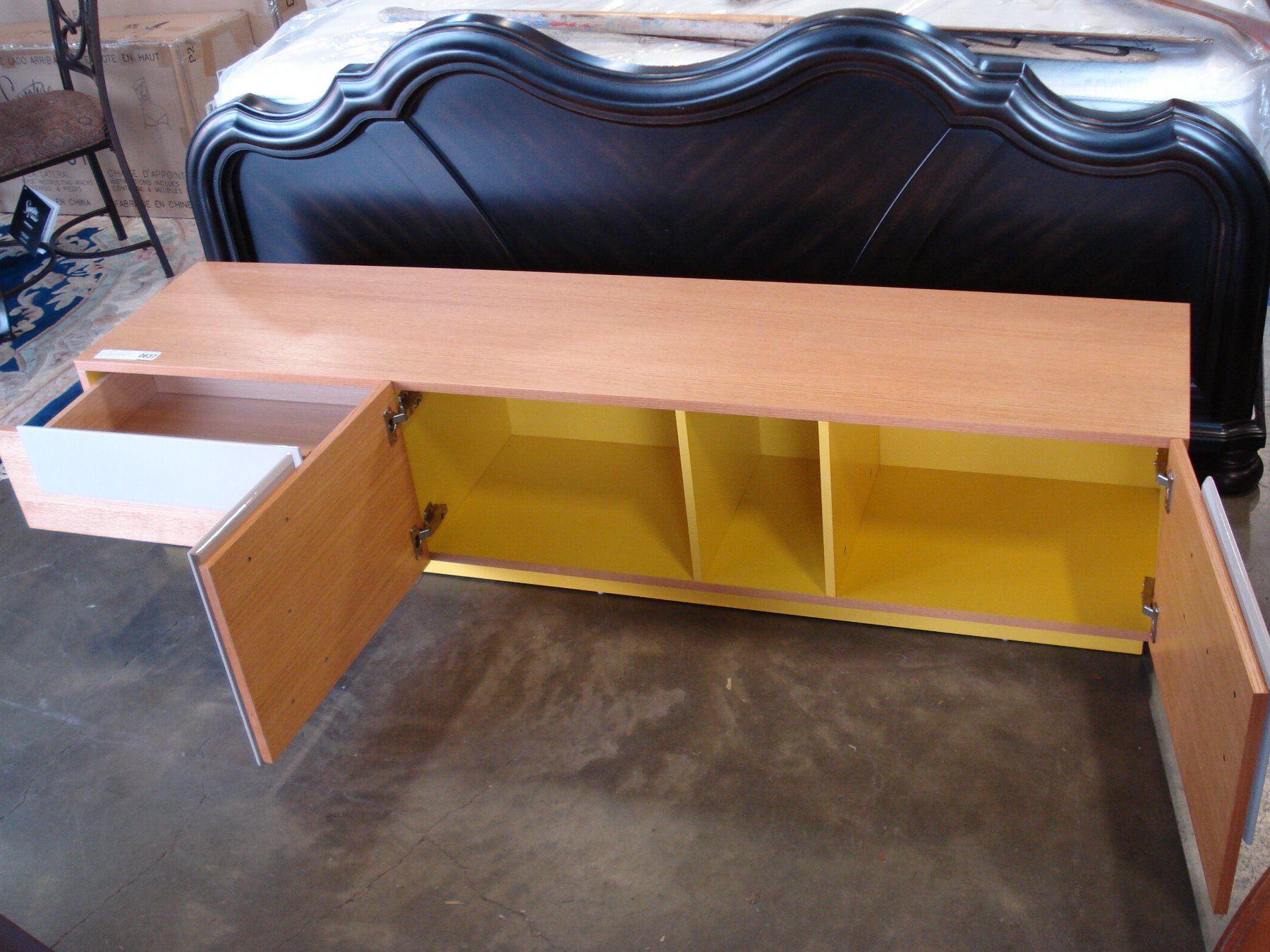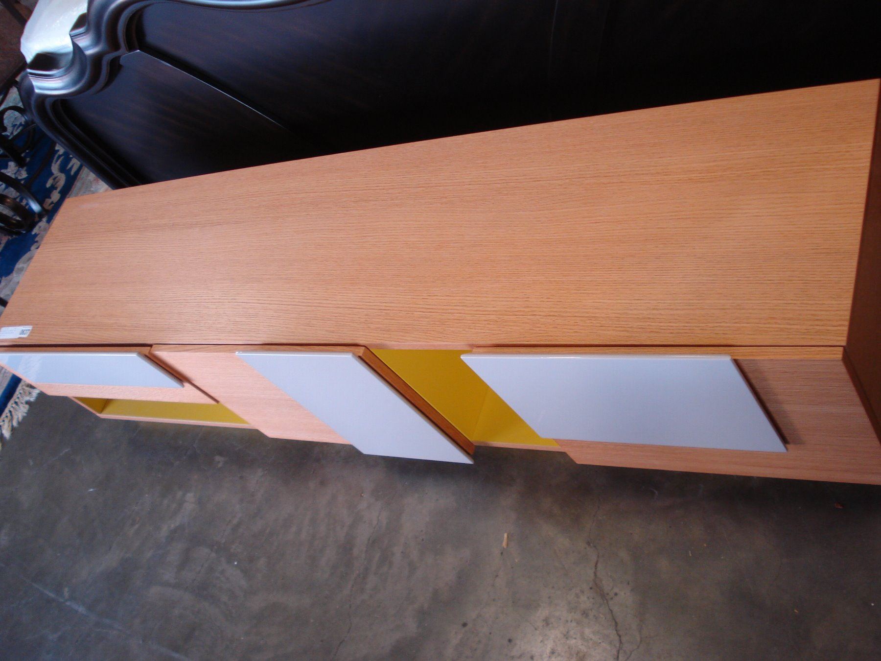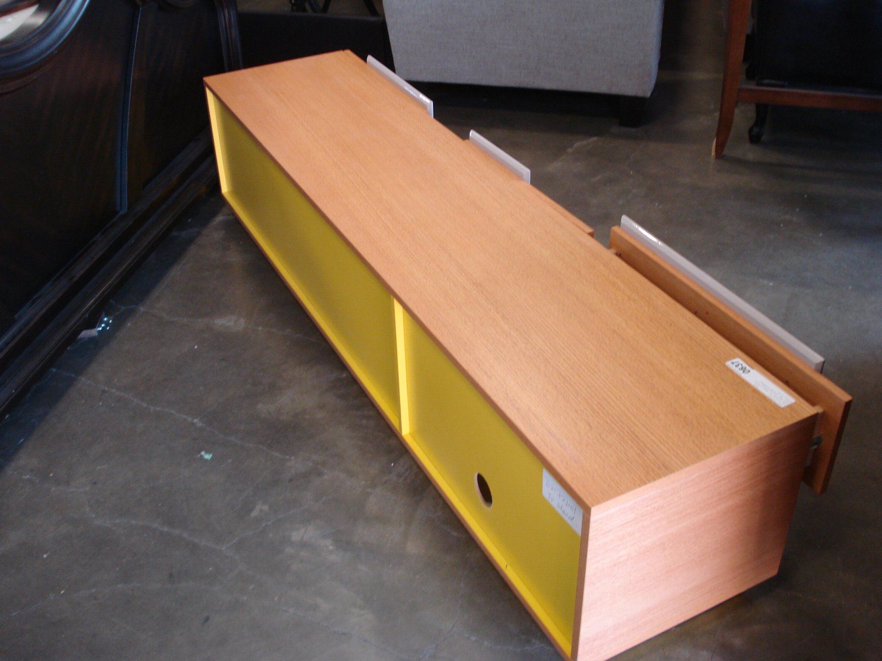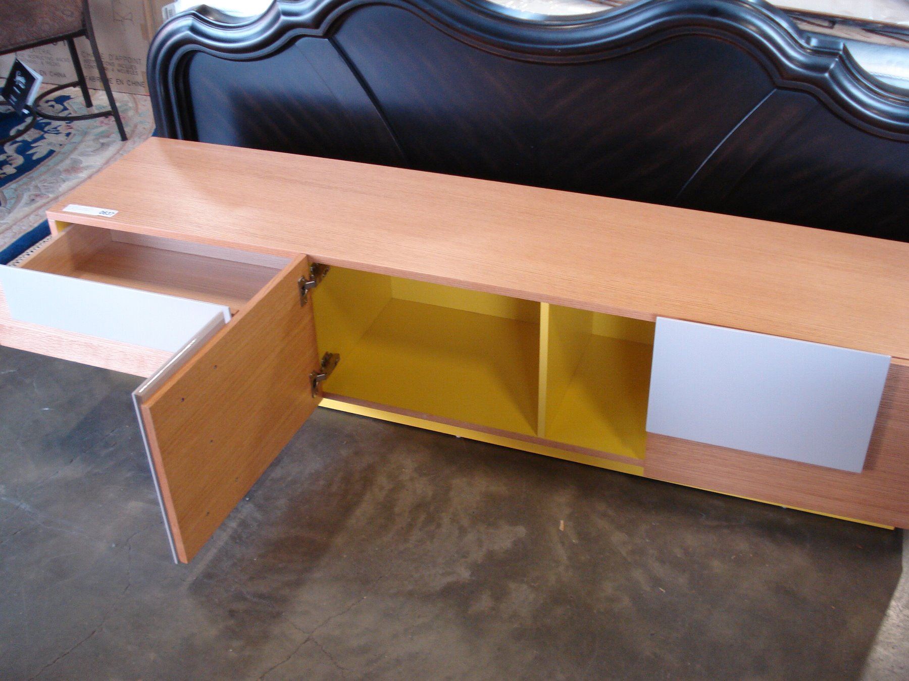 NEW MODERN TV CONSOLE WITH GREY AND YELLOW ACCENTS, RETAIL $799