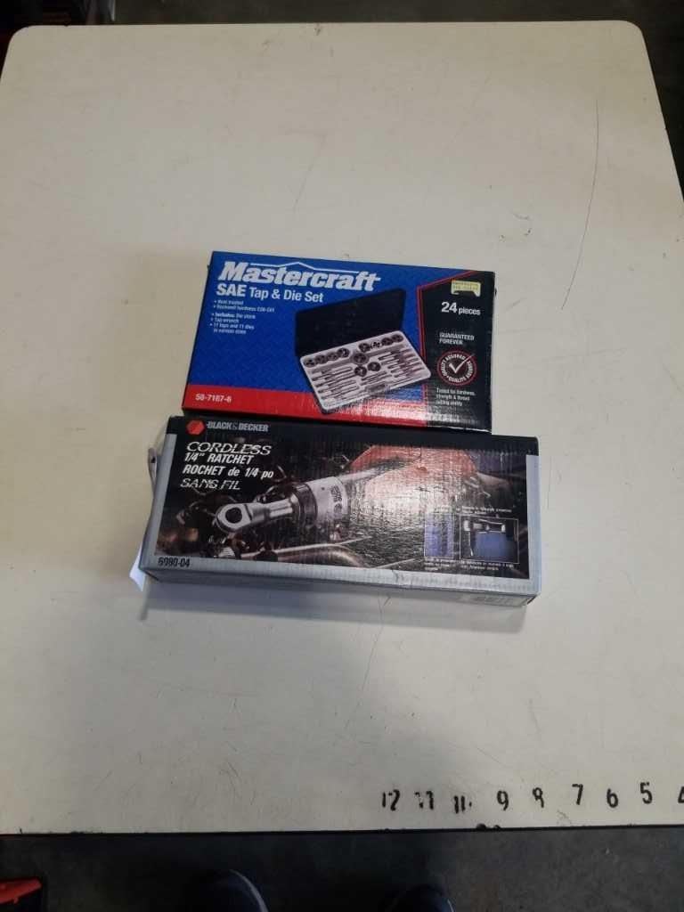 NEW OLD STOCK MASTERCRAFT TAP AND DIE SET AND BLACK AND DECKER CORDLESS 1/4 INCH RATCHET