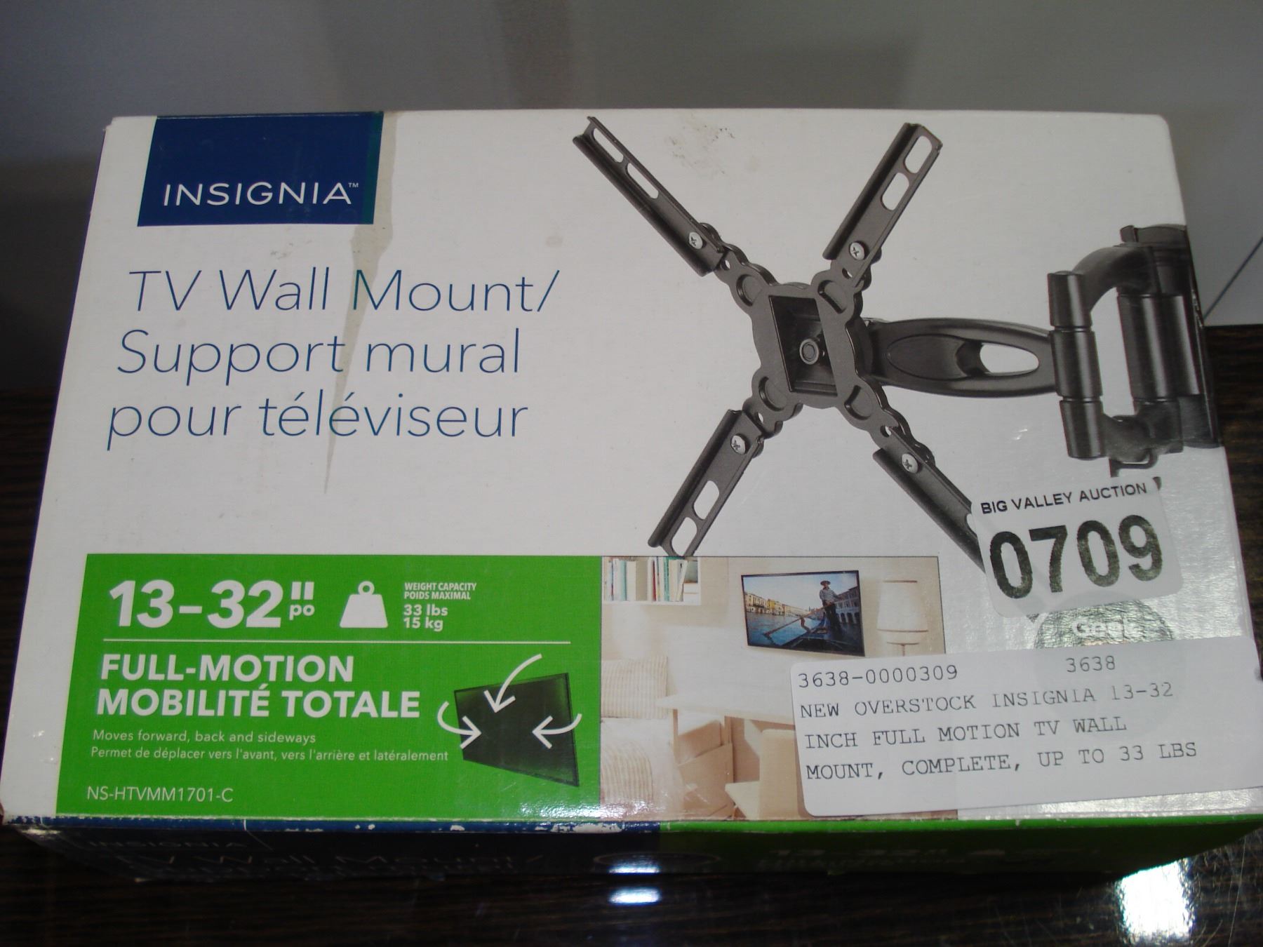 NEW OVERSTOCK INSIGNIA 13-32 INCH FULL MOTION TV WALL MOUNT, COMPLETE, UP TO 33 LBS