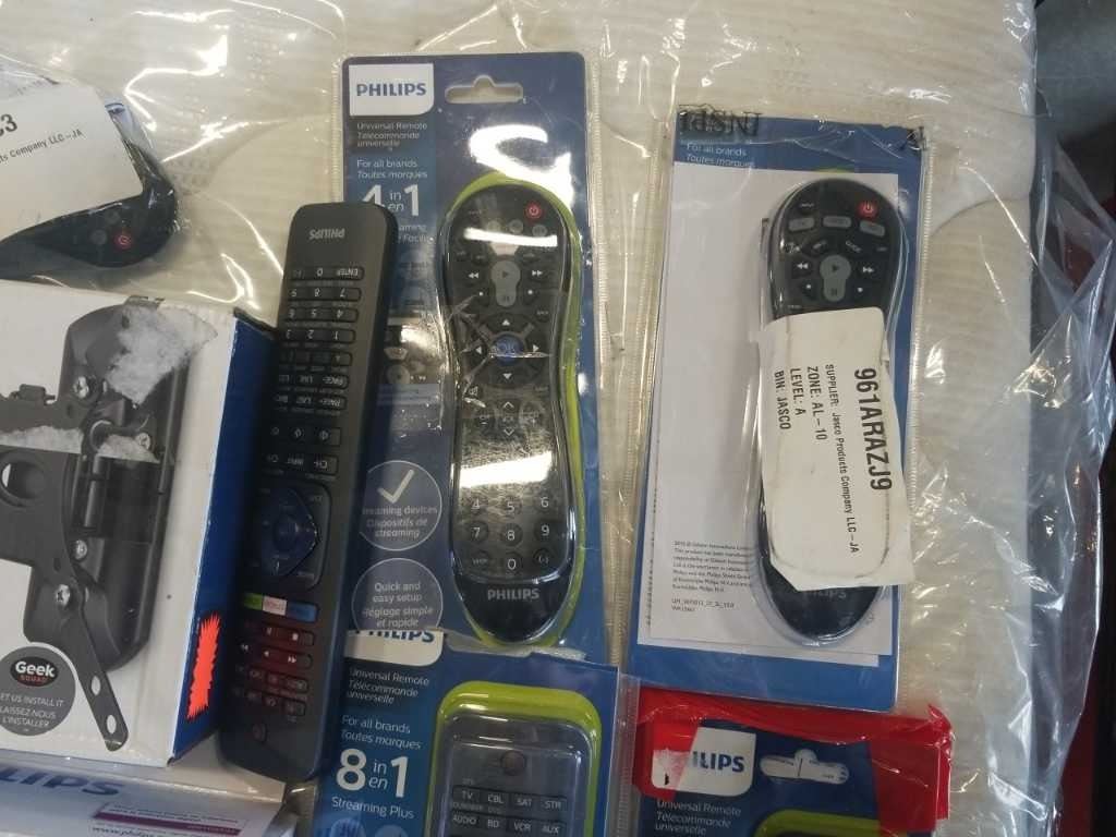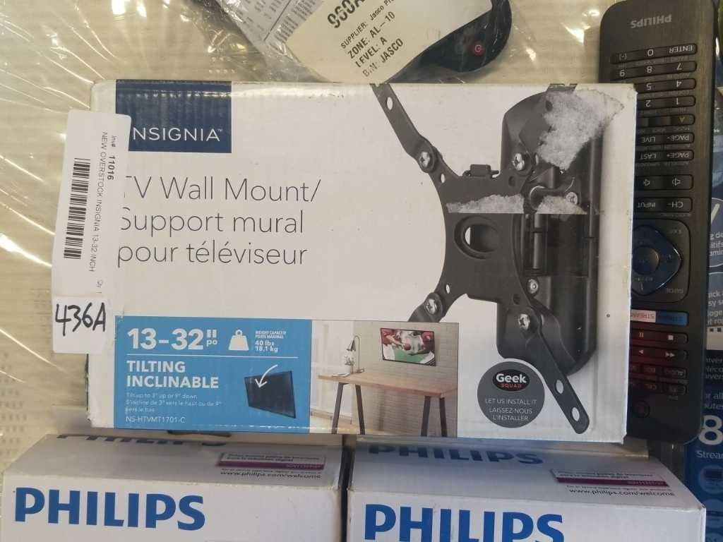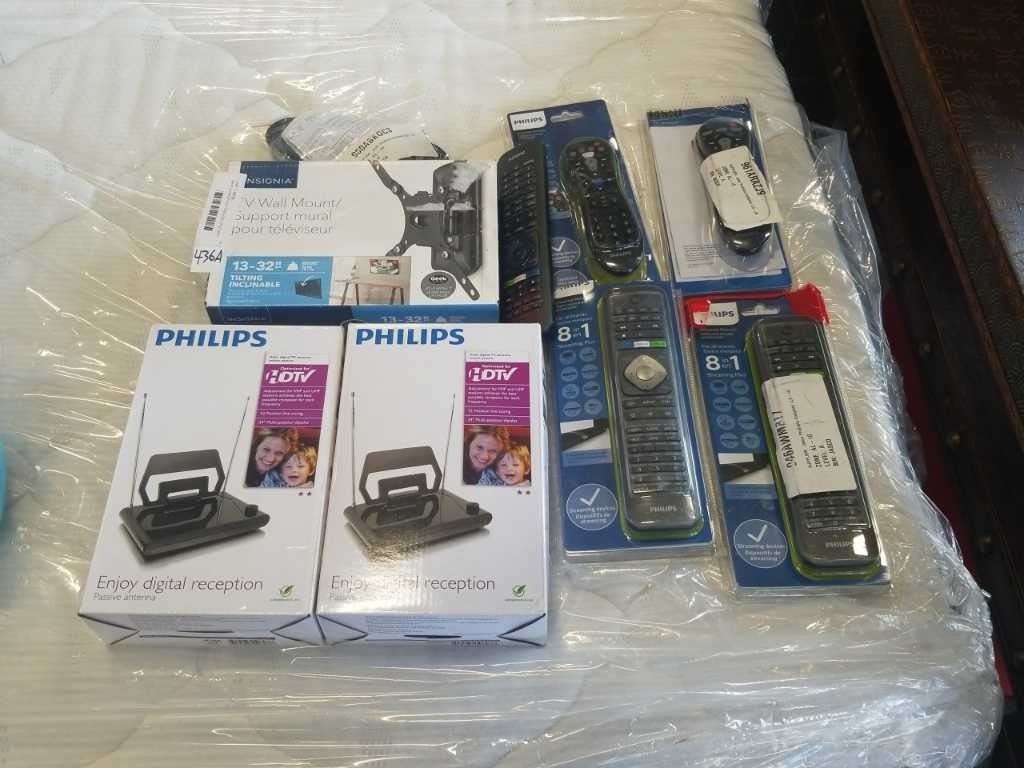 NEW OVERSTOCK INSIGNIA 13-32 INCH TILITING TV WALL MOUNT, 2 PHILIPS PASSIVE DIGITAL HD TV ANTENNAS AND LOT OF REMOTES, 8 IN 1 AND 4 IN 1