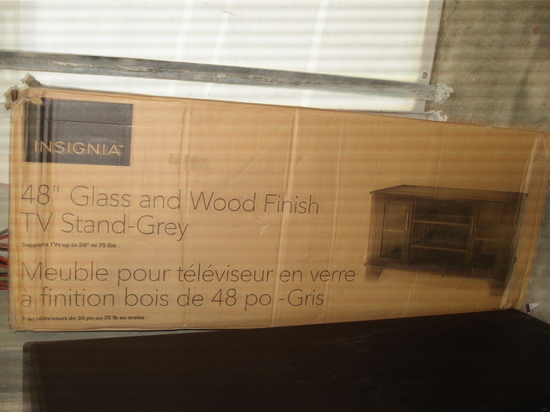 NEW OVERSTOCK INSIGNIA 48 INCH GLASS AND WOOD FINISH GREY TV STAND, SUPPORTS UP TO 50 INCH OR 75LB T